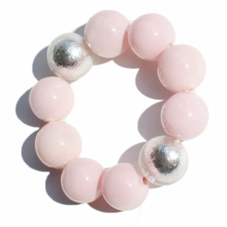 優しいピンク色に銀箔をレジンで閉じ込めたパーツがアクセントになったブレスレット。ゴムタイプなので着脱がしやすく、ストレスフリーなデザインです。
