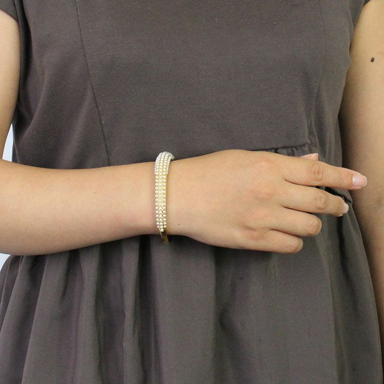 緩やかに幅が変わるアシンメトリーなオープンバングル。ケシパール(樹脂パール)を敷きつめたエレガントで華やかで着脱しやすいデザインです。パーティーシーンはもちろん、あえてカジュアルな装いにご使用いただくことでコーディネートを引き締め、大人カジュアルにご利用いただけます。