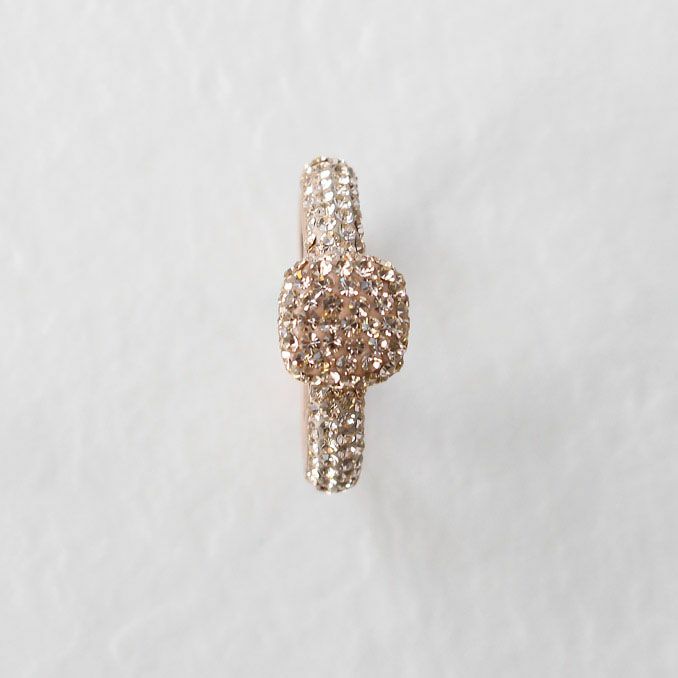 台座にはスクエアモチーフが煌々と輝くカクテルリング。リングにはチェコクリスタルがパヴェ状に敷き詰められ、エッジは丸みがあり柔らかな印象。