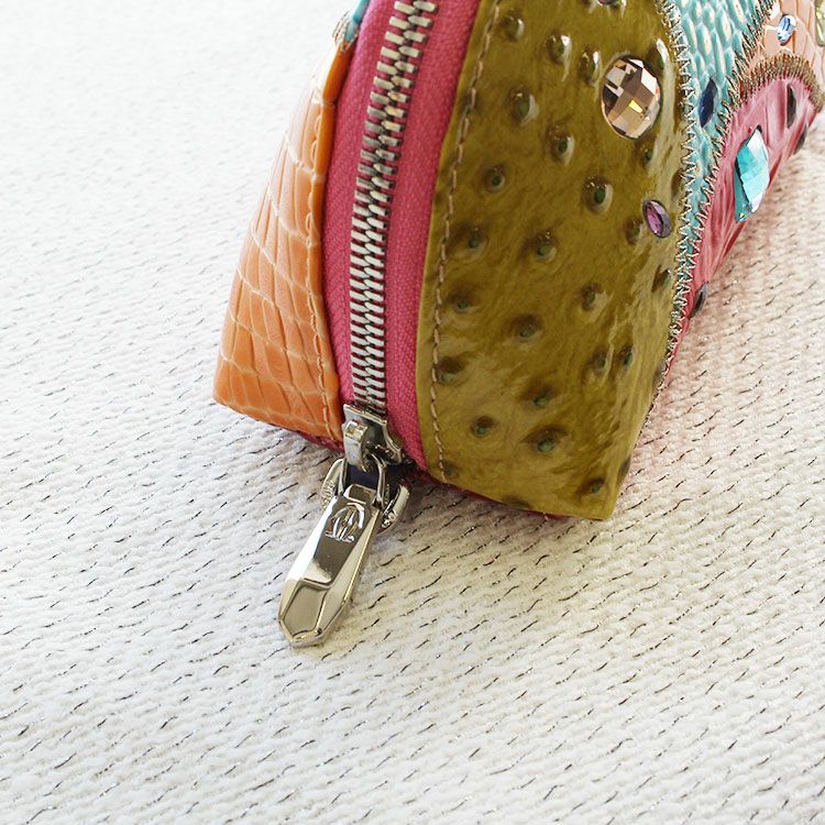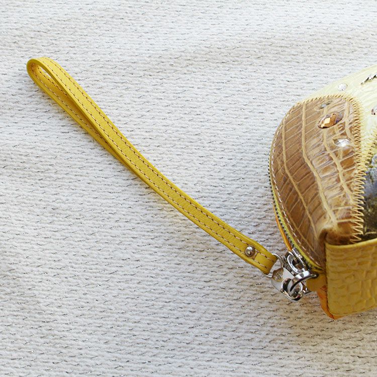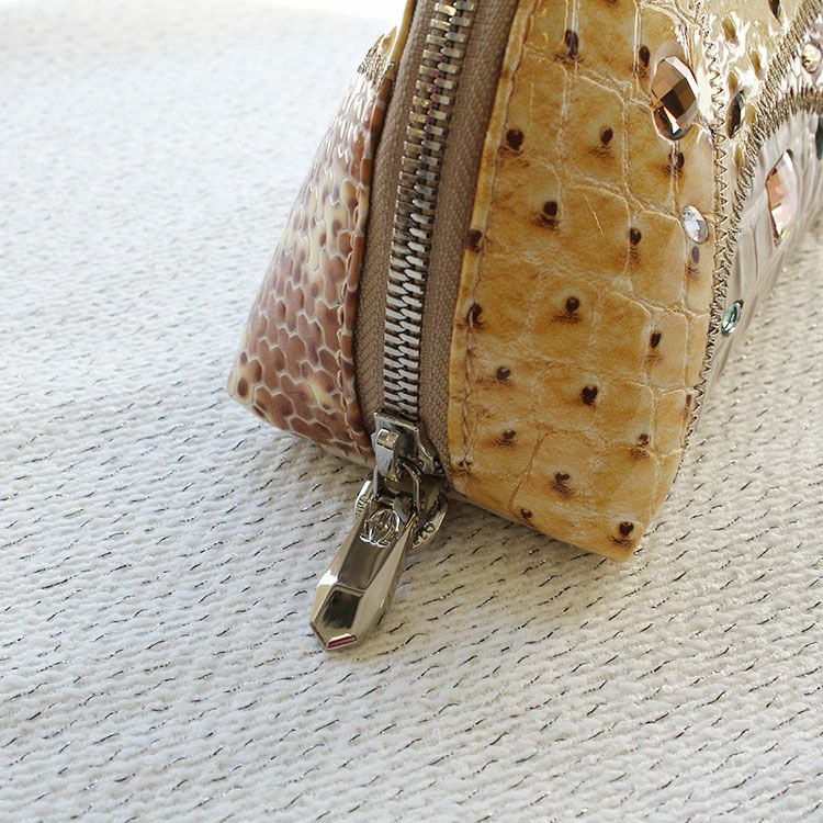 表面にあしらわれたガラスは、単に革の上に接着しているのではなく、革をカットして埋め込んでいるので、引っ掛かりが少ないのもポイント。