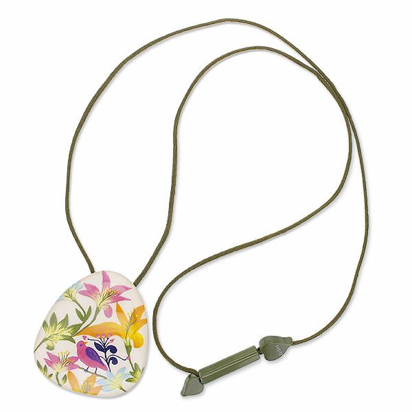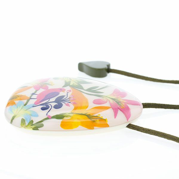 鮮やかなピンクの小鳥やお花が描かれた個性的なパーツを使用したネックレス。ハンドメイドで作られた一つ一つのパーツに、手作業で一点一点描いて仕上げているので、2つとして同じものはありません。