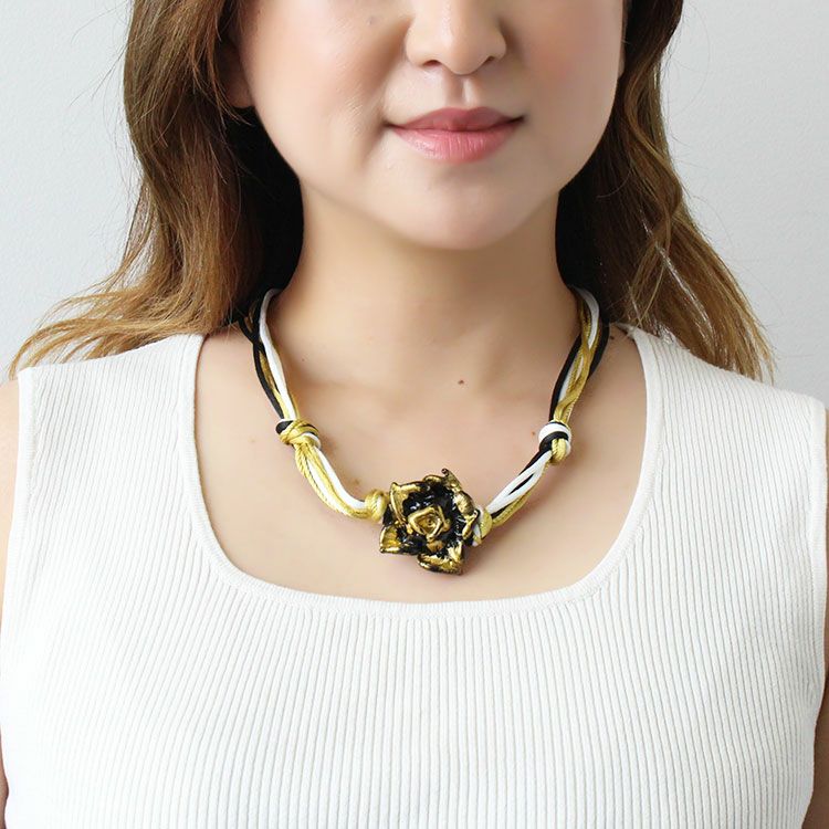 「オロロット(壊れた金箔)」の名のとおり、金箔が美しくクラッシュ模様を描くムラーノ島の伝統技法を用いて作られたローズモチーフパーツをシックなカラーのコードに通したネックレス。ノスタルジックなムードなのにどこか新鮮な、世代を超えて長く愛されるベネチアンガラスの魅力が感じられるネックレスです。