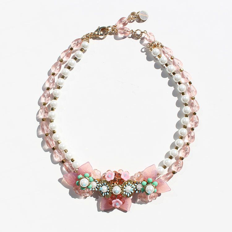 絶妙な色合いのフラワーモチーフに美しい光沢が魅力のガラスパールとチェコビーズが2連になったショートネックレス。パールやチェコビーズの間のゴールドパーツがアクセントになって、全体を雰囲気をキリっと引き締めています。正面のフラワーモチーフは複数のパーツを組み合わせた繊細なデザイン。お顔周りをより華やかに演出しています。パーティーや会食はもちろん、カジュアルなど幅広いシーンでご利用いただけます。