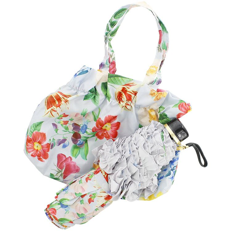 アビステオリジナルデザインの鮮やかな花柄のプリント傘。6本骨で、折り畳み傘ながらもしっかりとした作りに。専用のバッグは、傘入れとしてお使いいただけるのももちろん、ご近所に出かけるときのお買いものバッグとしても◎