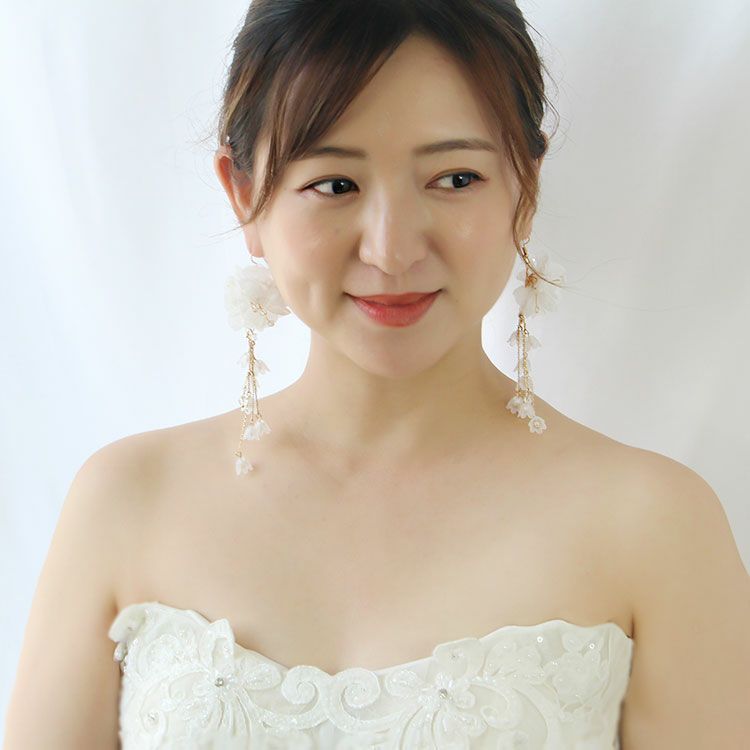 ふわふわのシフォンフラワーに、さらさらとチェーンが揺れ動くロマンティックなデザインのピアス。チェーンにはすりガラスのようなすずらんモチーフ。幸福を花言葉に持つすずらんは、ブライダルなど特別なシーンにもぴったりです。