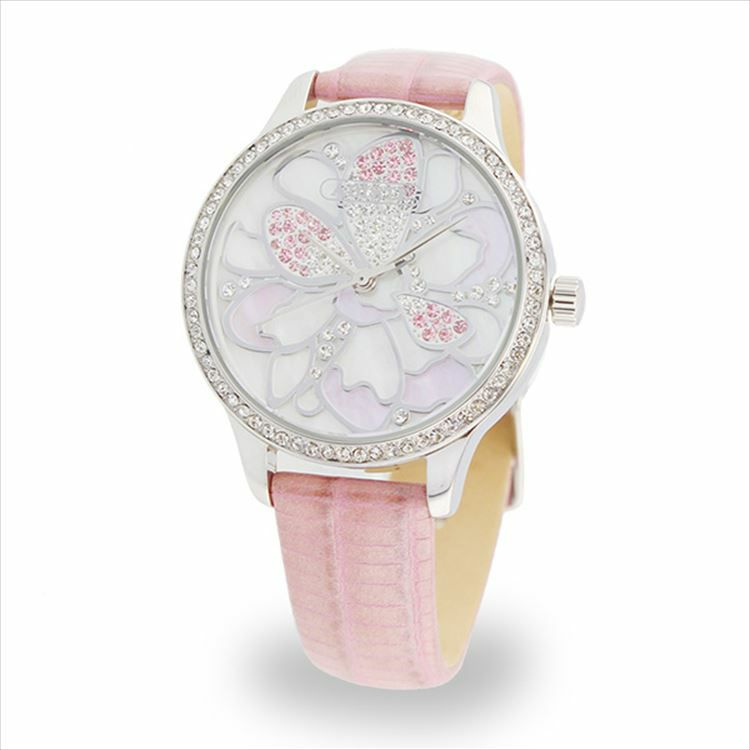 文字盤の中にお花柄があしらわれたエレガントな腕時計。MOPの上品な輝きと、グラデーションにあしらわれたチェコクリスタルガラスが、大人っぽく華やかなデザイン。