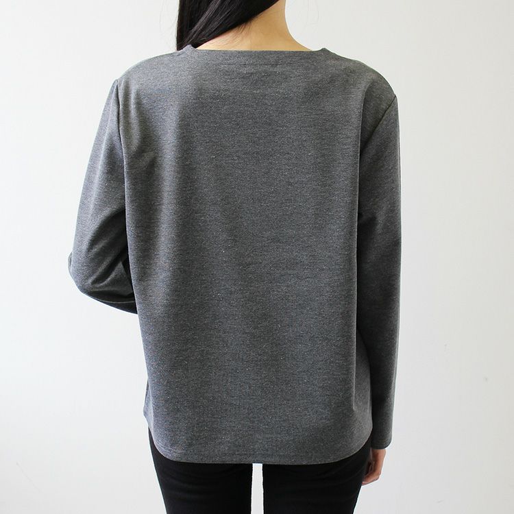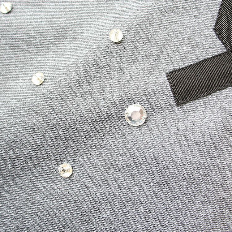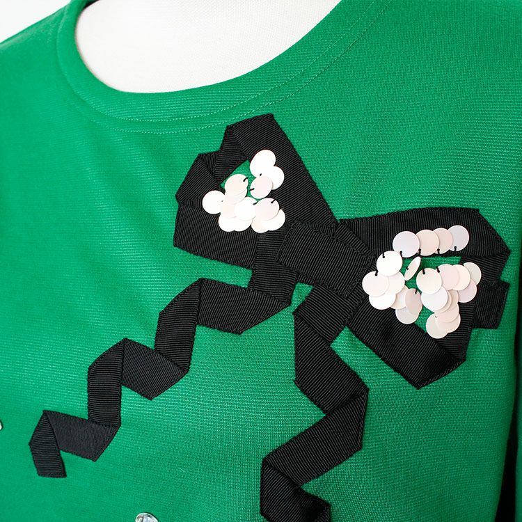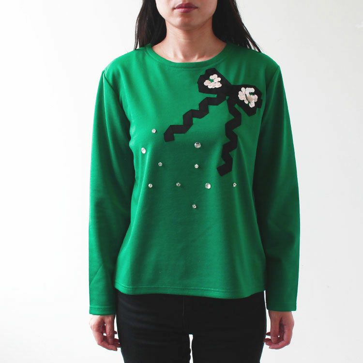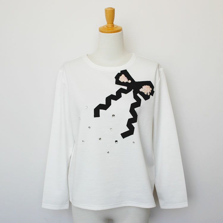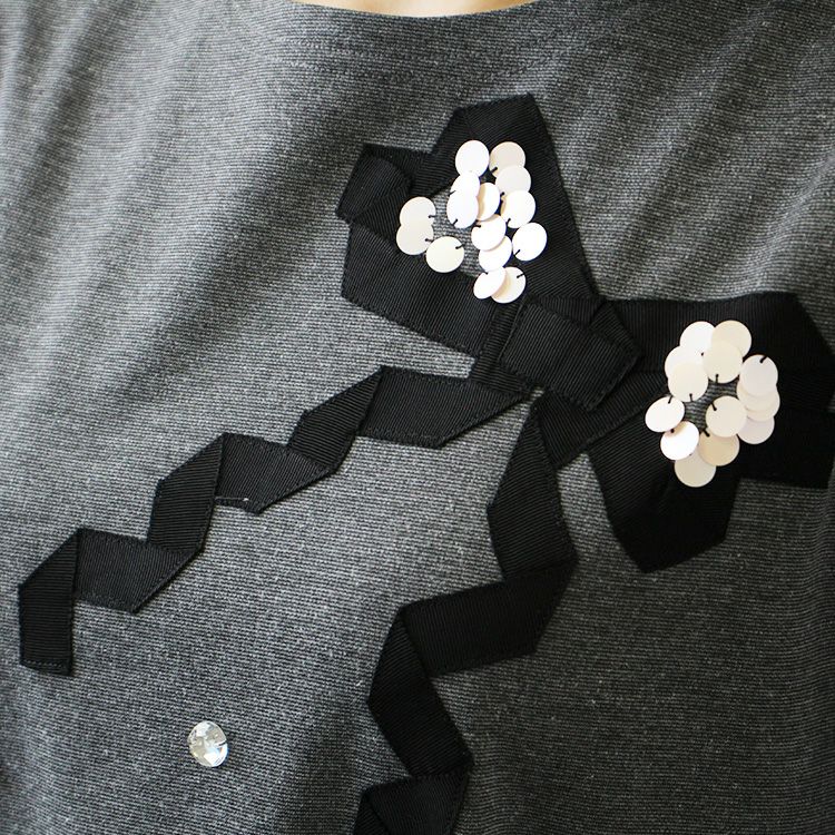 グログランテープで形作られたリボンに、スパンコールやビジューをあしらったカットソー。パンツにもスカートにも合わせやすく、1枚でレディなスタイルに。