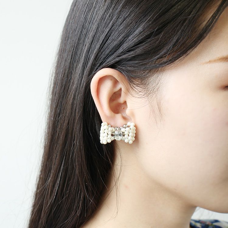 【日本製】リボンモチーフビジュー付きパールイヤリング/3220005