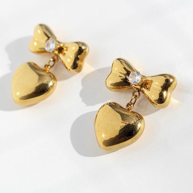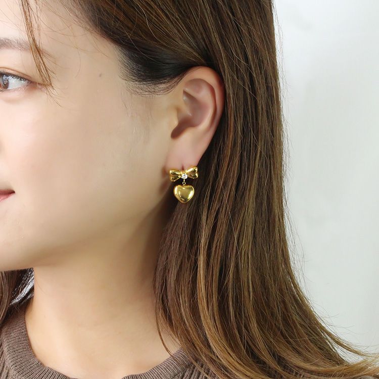 キラキラが付いたリボンに揺れるハート、乙女心をくすぐるようなモチーフを組み合わせたピアス。ゴールドの地金風アクセサリーなので、フェミニンなスタイルはもちろん、カジュアルや甘さを抑えたスタイルにもマッチします。