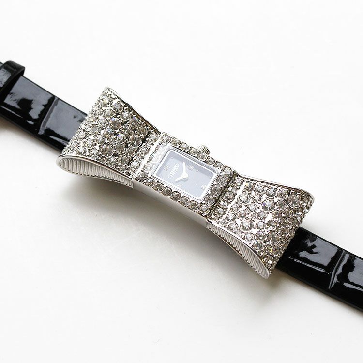 大きなリボンにチェコクリスタルガラスが敷き詰められた大人かわいいベルト時計。しっかりリボンが感じられる存在感のある大きさはジュエリー感覚でもご利用いただけます。