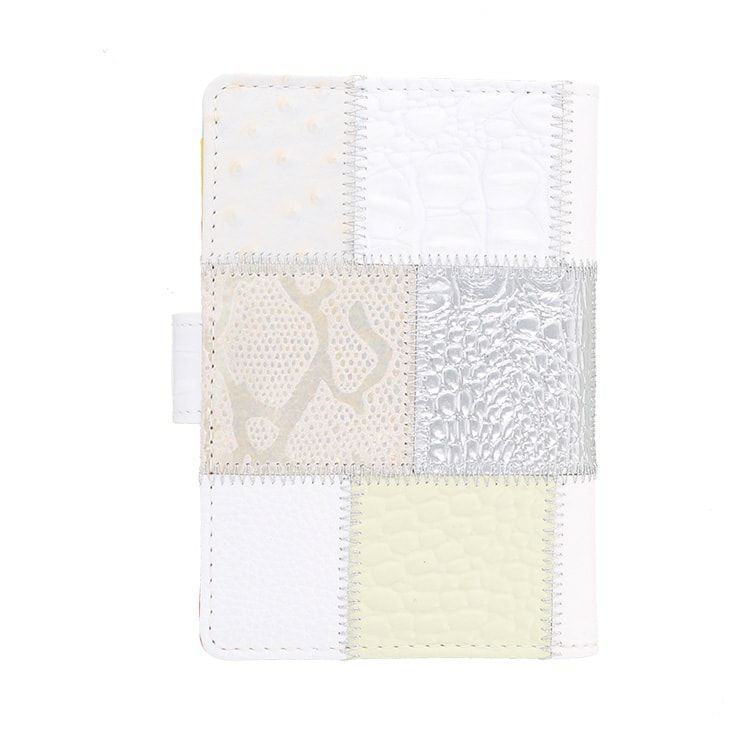 カード入れやペンホルダーもついて、機能性も重視して作られています。 表面にあしらわれたガラスは、単に革の上に接着しているのではなく、革をカットして埋め込んでいるので、引っ掛かりが少ないのもポイント。