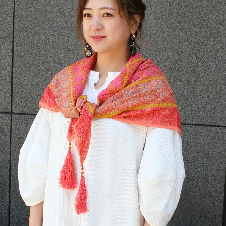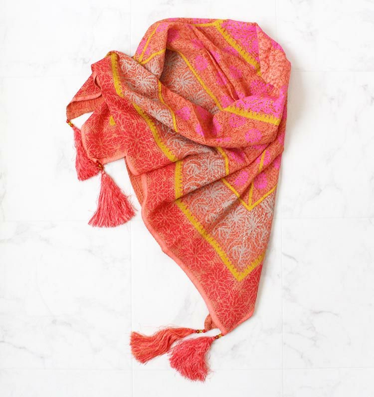 鮮やかな色合いの大判ストール。インド織物に更紗プリントが施された手の込んだ一品です。レーヨン100%で張り感がありしっかりとした素材。シンプルなお洋服もたちまち主役級のコーデに早変わりさせてくれそう。オシャレな大人の女性にふさわしいストールです。