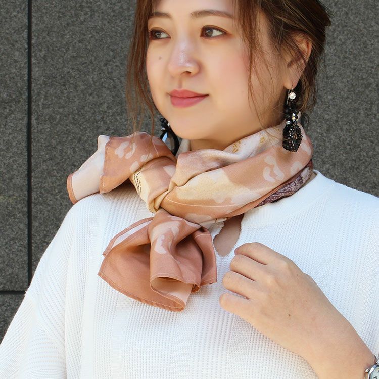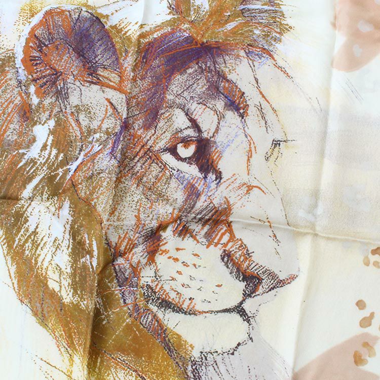 サラリとしたシルク100%のスカーフは大きなライオンの顔が中央にプリントされたオシャレなデザイン。肌触りがよく、柔らかな風合いが長時間の着用でも肌にストレスを与えません。