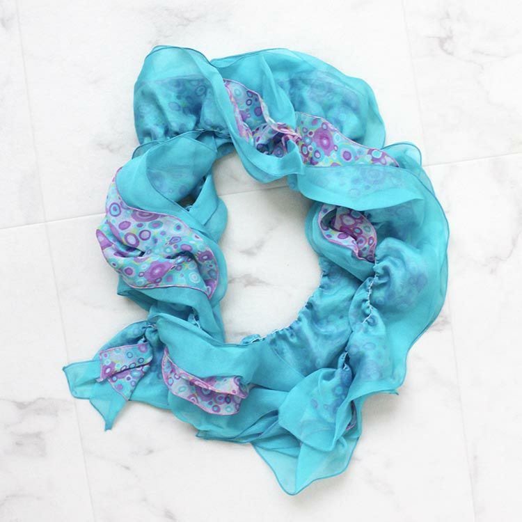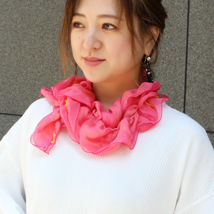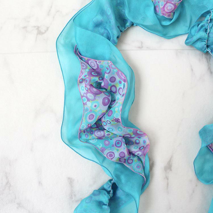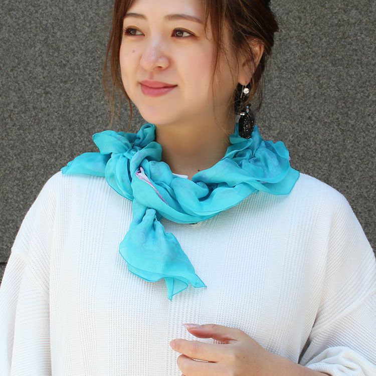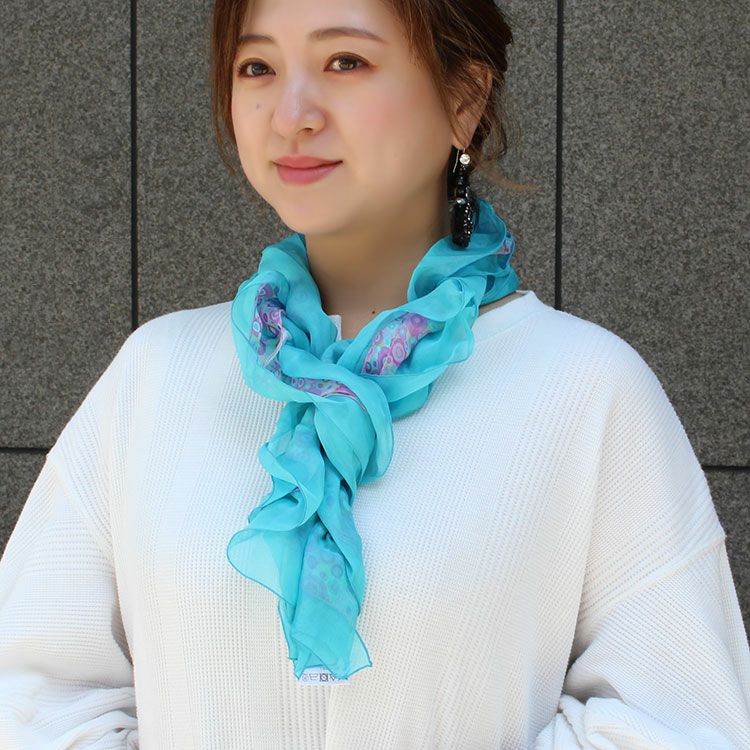ヨーロッパらしい美しい色合いのフランス製シルク100%細ストール。薄手のシフォン素材は、カラフルな無地とポップでサイケデリックなアートプリントが施された生地が重なった2枚構造。チラッとプリント部分が見えるバランスが絶妙で、シンプルなコーデのアクセントにピッタリです。