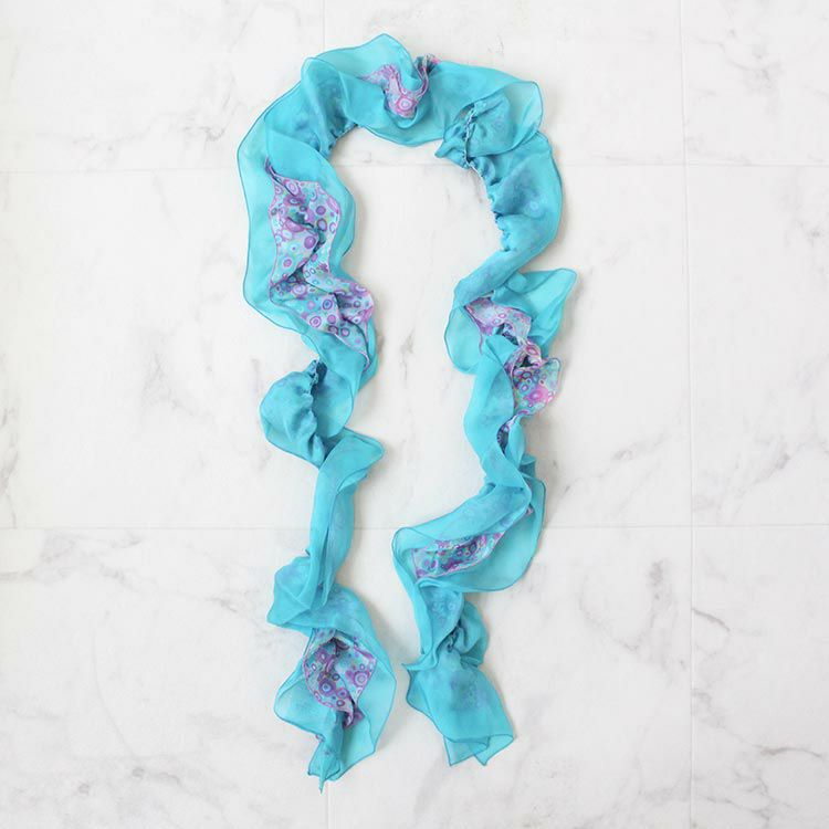 ヨーロッパらしい美しい色合いのフランス製シルク100%細ストール。薄手のシフォン素材は、カラフルな無地とポップでサイケデリックなアートプリントが施された生地が重なった2枚構造。チラッとプリント部分が見えるバランスが絶妙で、シンプルなコーデのアクセントにピッタリです。