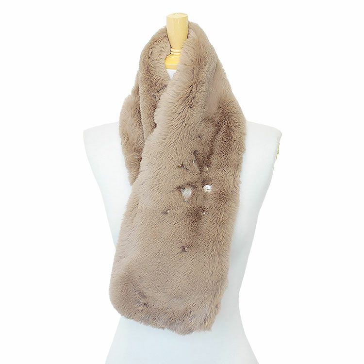 フワフワとした手触りがたまらないエコファーストール。いつものコーディネートに加えるだけで一気にエレガントな雰囲気に。大振りのクリスタルガラスが動くたびに美しく輝きます。