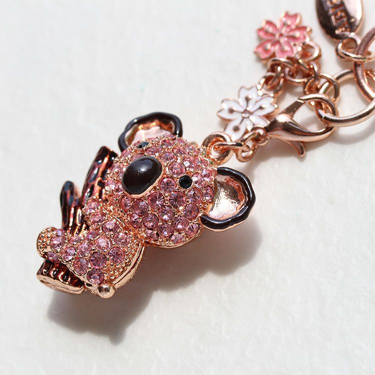 優しいピンクのコアラをモチーフにしたキーホルダー。フラワー型のチャームもセットになったデザインで、裏面もお花模様の透かしになっています。