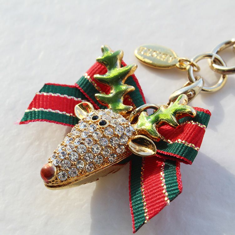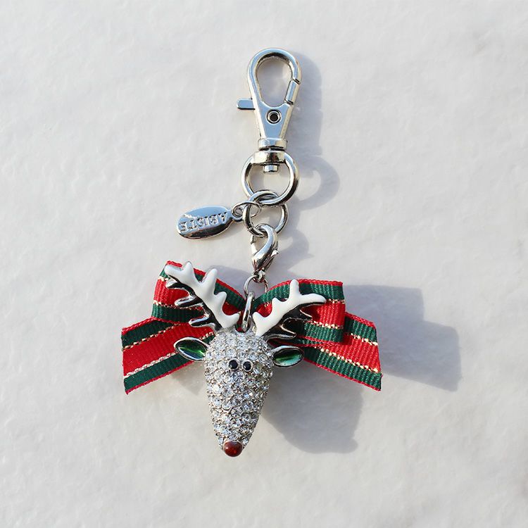 愛らしい表情のトナカイと、クリスマスカラーのグログランリボンをチャームにしたアイテム。キーホルダーやバッグチャームとしてお使いいただけます。