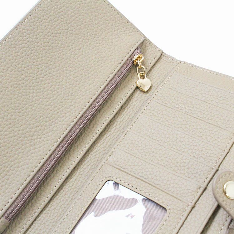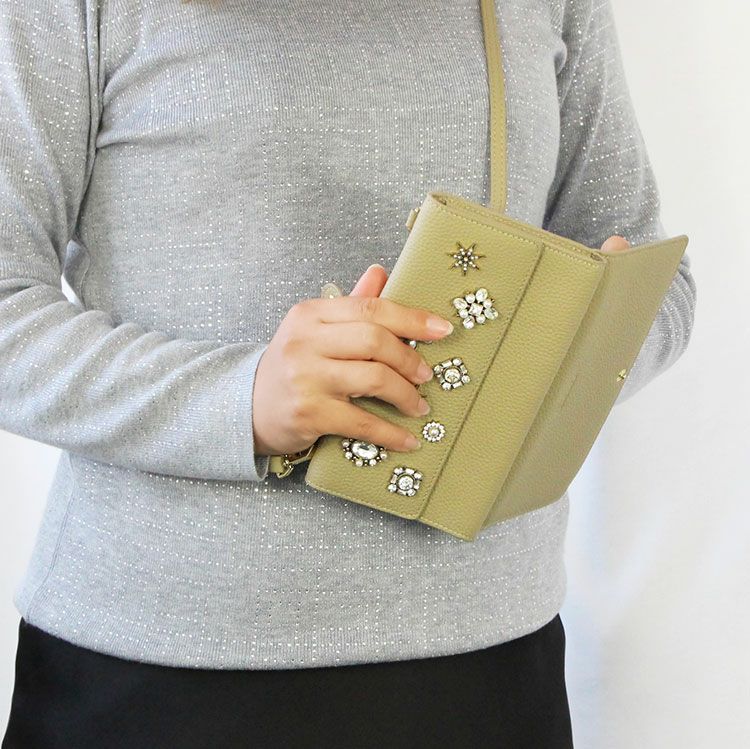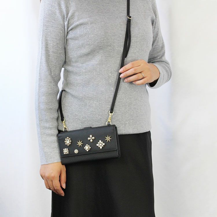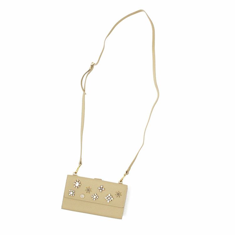 マットな質感の上品なシボレザー(牛革)に様々なビジューストーンを配した財布機能付きのショルダーバッグ。スマートフォンが入れられる正面のフラップポケットは三角形のマチにすることで大きく開いて取り出しやすいよう設計されています。背面はカードポケットが充実した財布になっており、チャーミングなハート型引き手のファスナーポケットには小銭が収納可能。