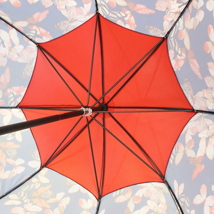 配色にバタフライモチーフの転写プリントがエレガントな長傘。大人の女性にふさわしいアンブレラです。傘のサイズは直径約90cmとゆったりとしていて濡れにくい安心サイズです。