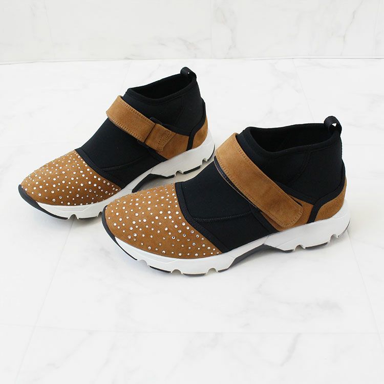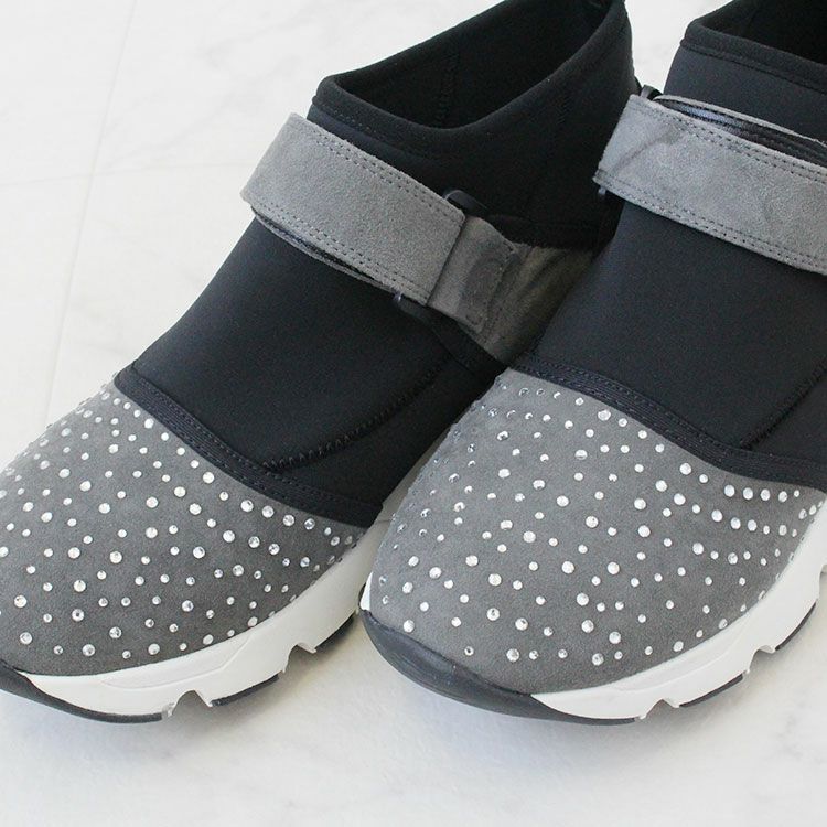 キラキラのクリスタルガラスがあしらわれたスエード調生地とウェットスーツのような柔らかい生地が用いられたスニーカー。スポッと履くことができ、ベルクロでフィット感の調節が可能。