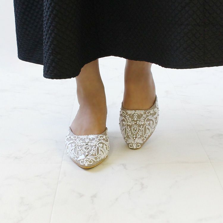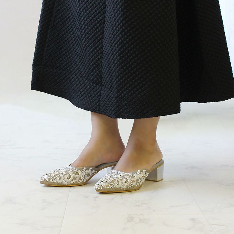 優しいグレージュの生地に真っ白な糸、ビーズやクリスタルガラスで華やかな刺繍が施されたミュール。立体感のある刺繍は職人によって一つひとつ丁寧に作られています。