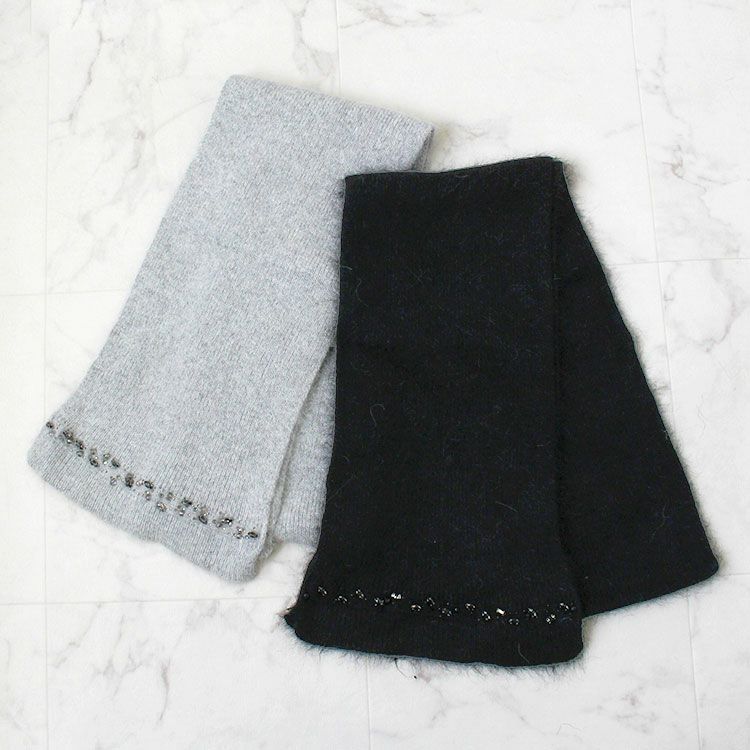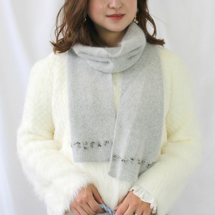縦に一列に並んだビジューがアクセントになったニットマフラー。首に巻くだけでたちまちオシャレな雰囲気に。冬の装いをエレガントに飾ります。