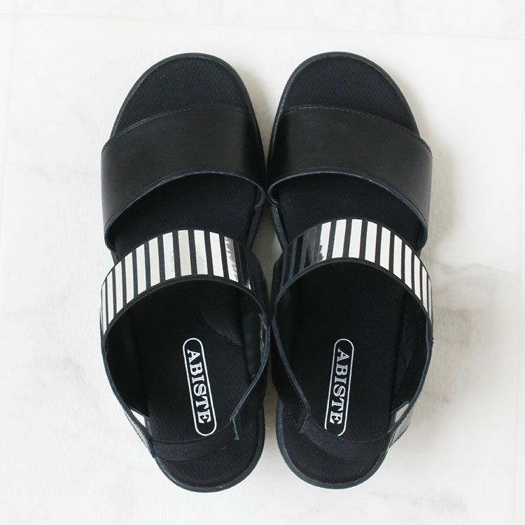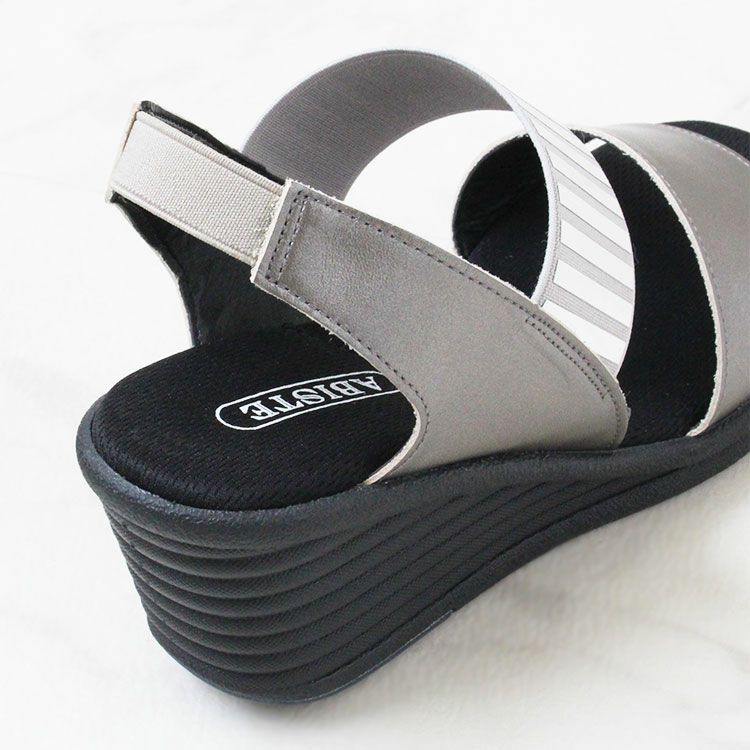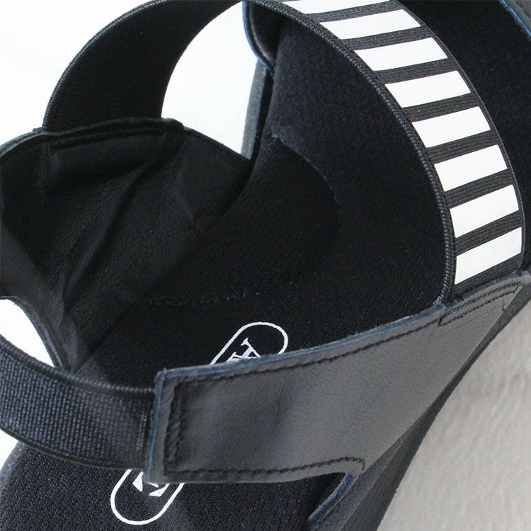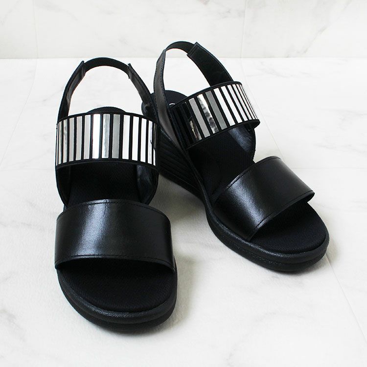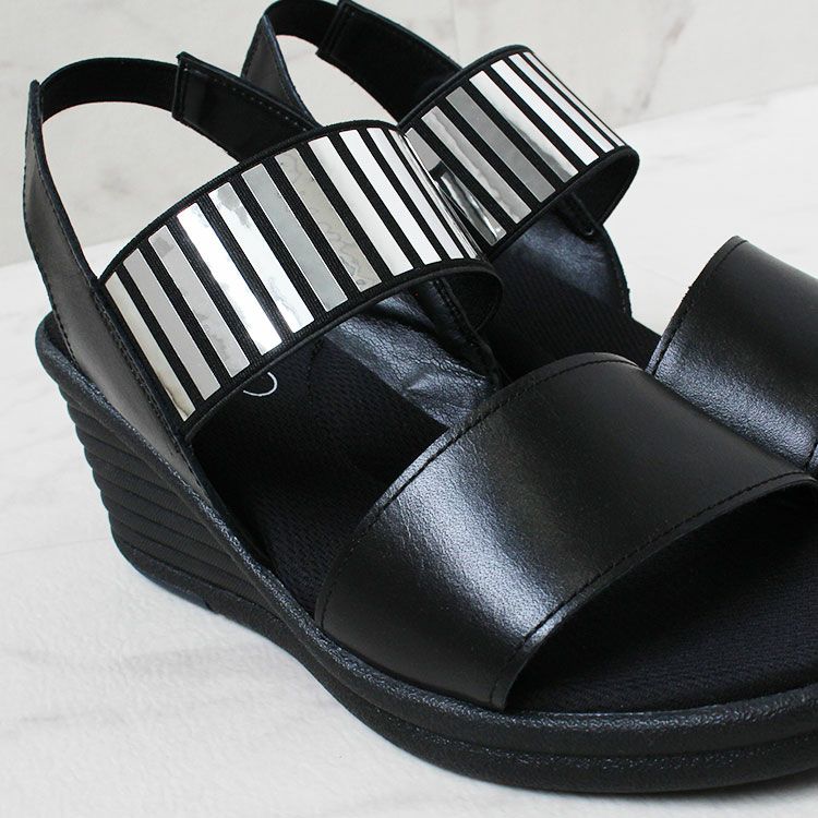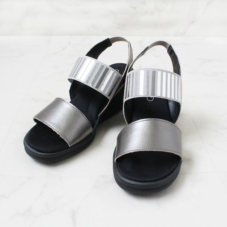 メタリックなストライプがアクセントになった幅広ベルトのサンダル。