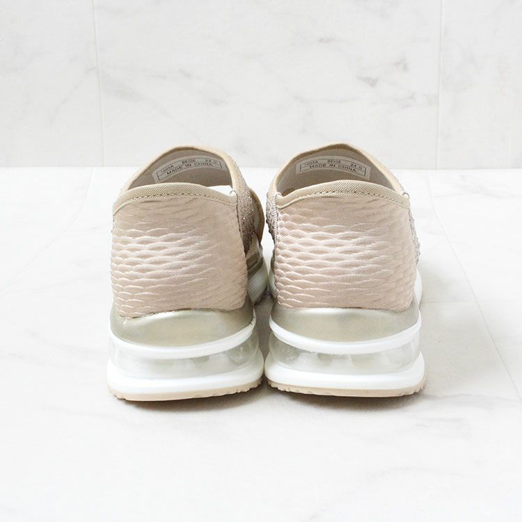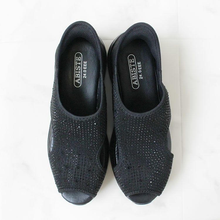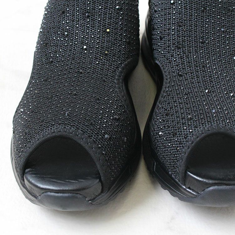 アッパー部分に雨粒のようにストーンがあしらわれたスリッポンタイプのニットサンダル。