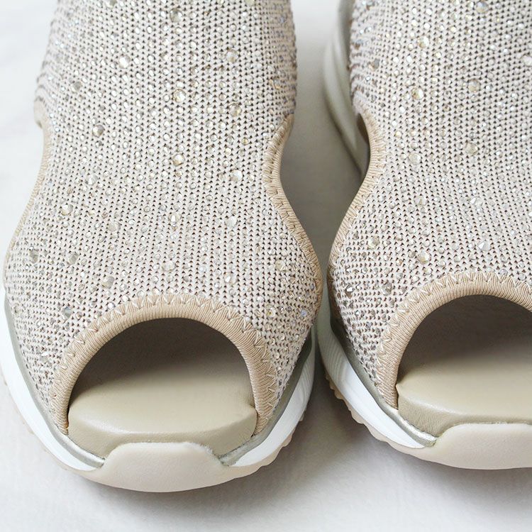 アッパー部分に雨粒のようにストーンがあしらわれたスリッポンタイプのニットサンダル。