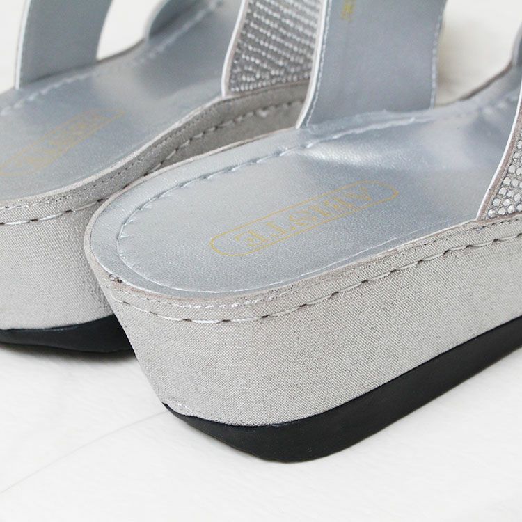 メタリックシルバーがこなれたおしゃれに見せてくれる、キラキラ輝くローズモチーフがアクセントのミュールタイプサンダル。
