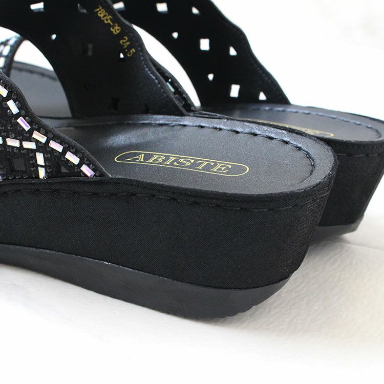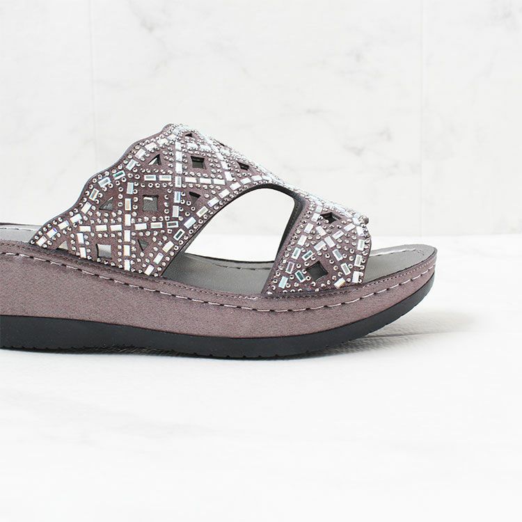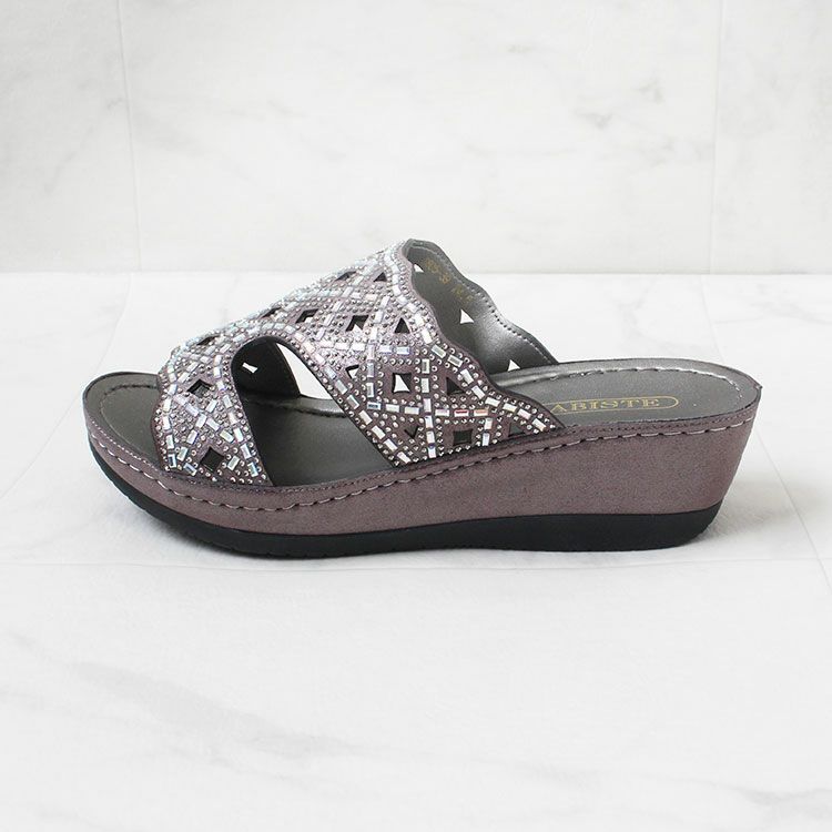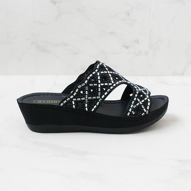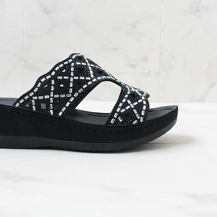 キラキラのストーンがアッパーの全面にあしらわれたミュールタイプのサンダル。