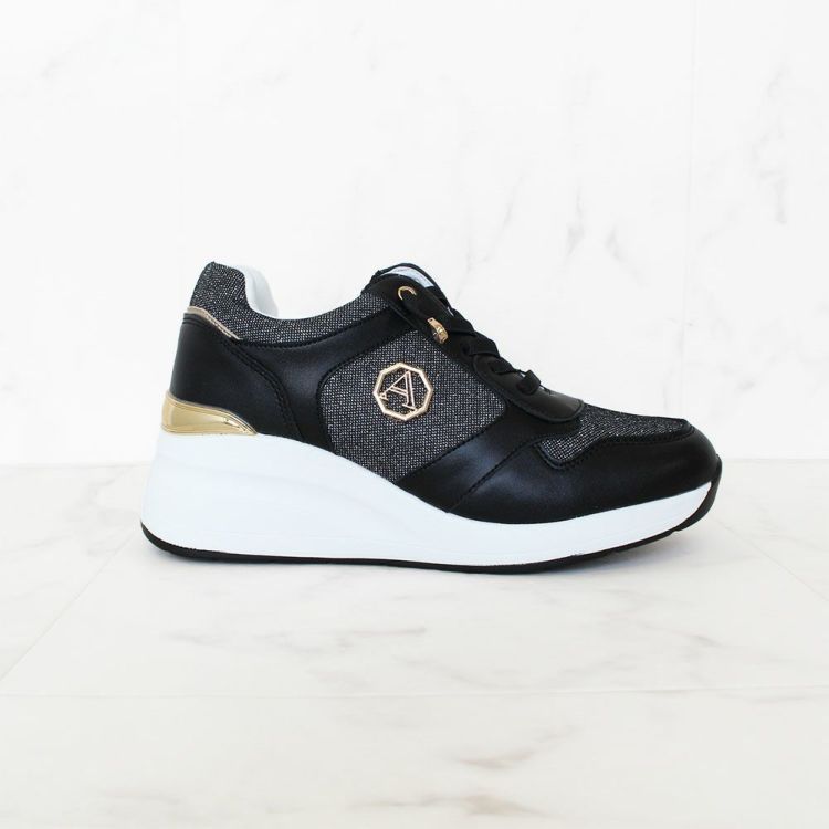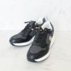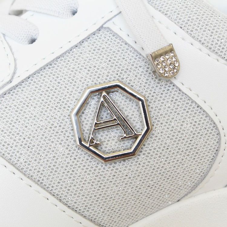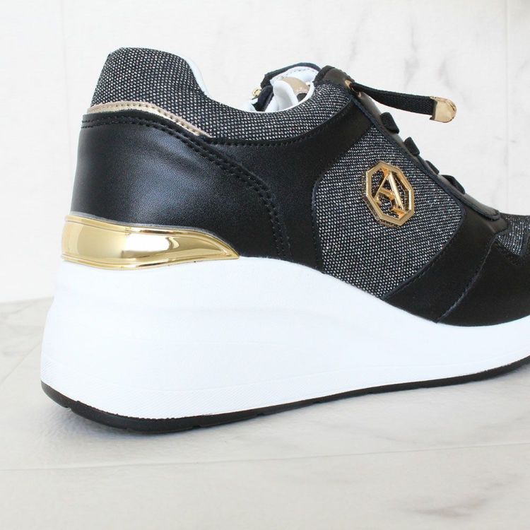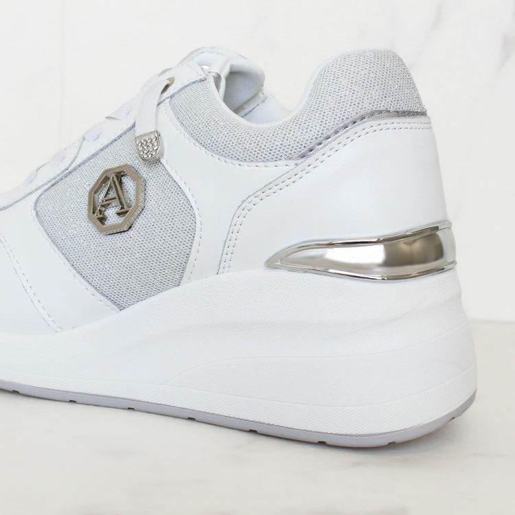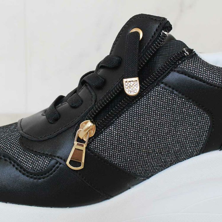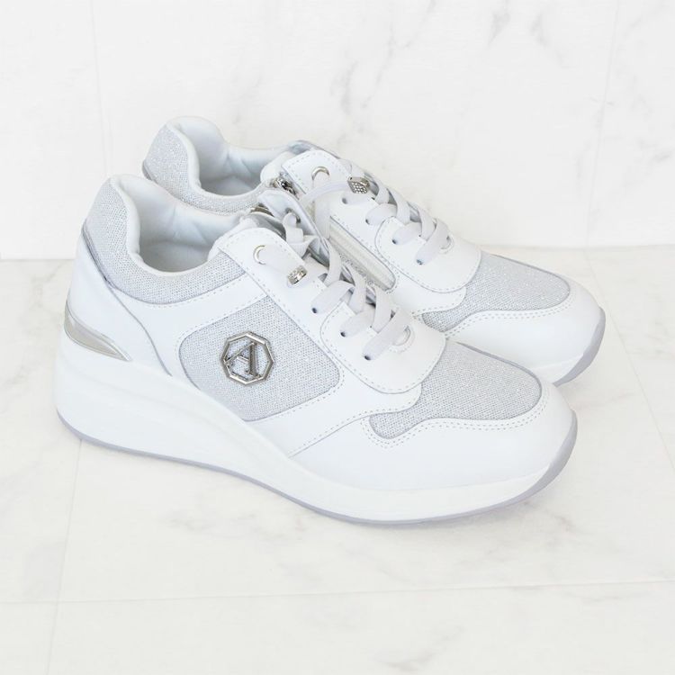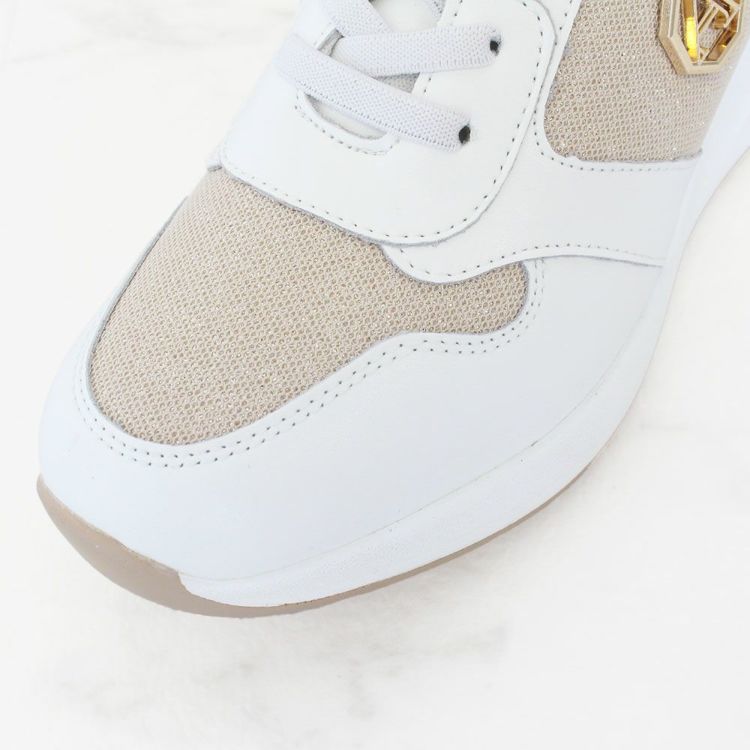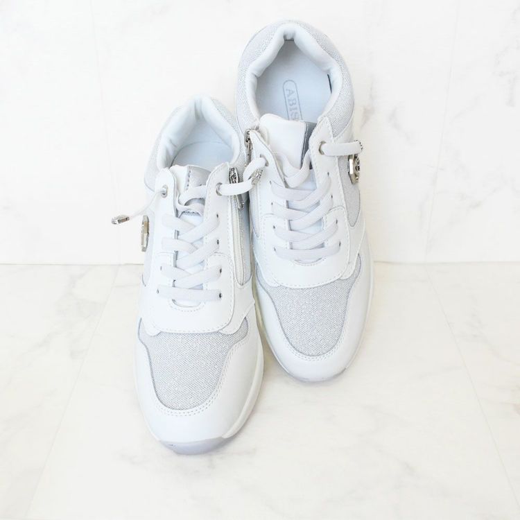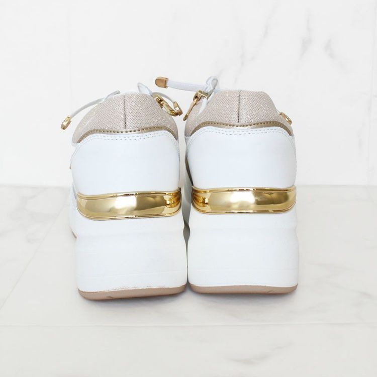 レザー(牛革)とラメ感のあるメッシュ生地を組み合わせたスニーカー。つま先は幅広すぎずきれいめなシルエットで、かかとの高いヒールアップ形状でスタイルアップ見えが叶います。ヒールスニーカーながら比較的軽量で、前部分の厚みもあるためヒールの高さも感じにくい設計。