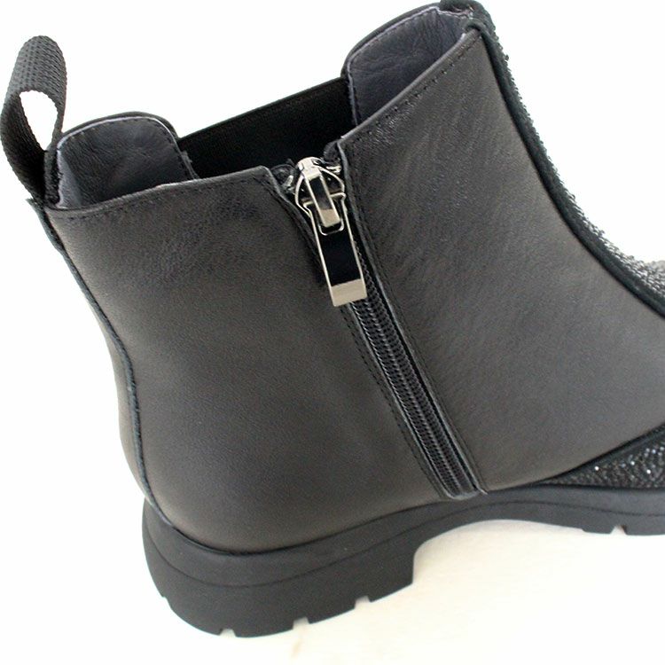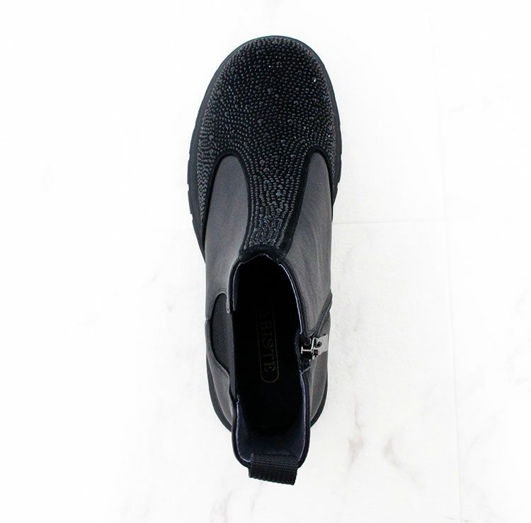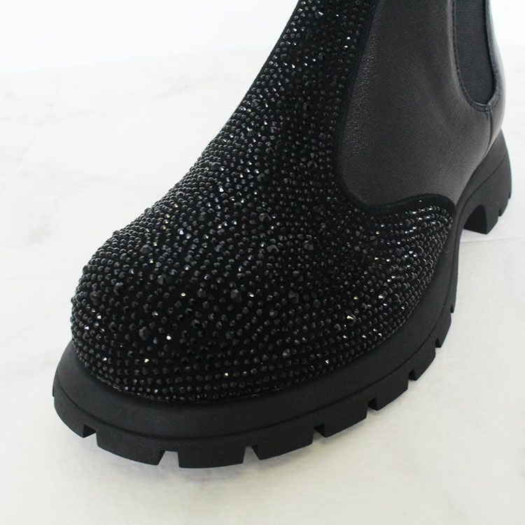 柔らかな牛革に細かなビジューが敷き詰められたショートブーツ。サイドゴアなので伸縮性がありスルッとした履きやすさも抜群です。底材には軽くて足への負担が少なく、疲れにくいのが特徴のEVA合成底を使用。優れたクッション性で歩行時の衝撃をしっかり吸収し、長時間の歩行でも快適さを保てます。 また水に強く汚れがつきにくいのでお手入れも簡単。オシャレなデザインに実用性も兼ね備えています。