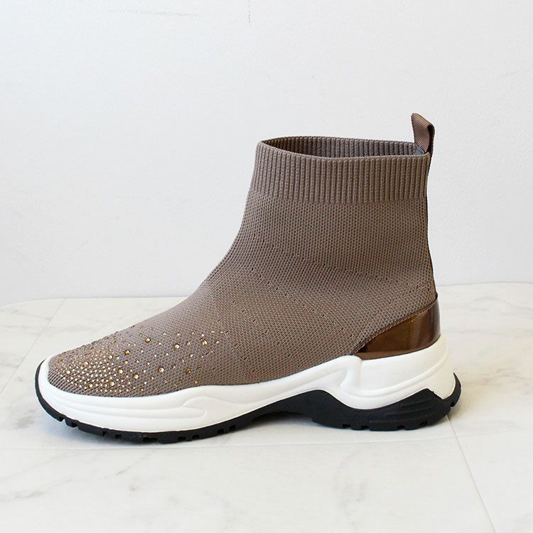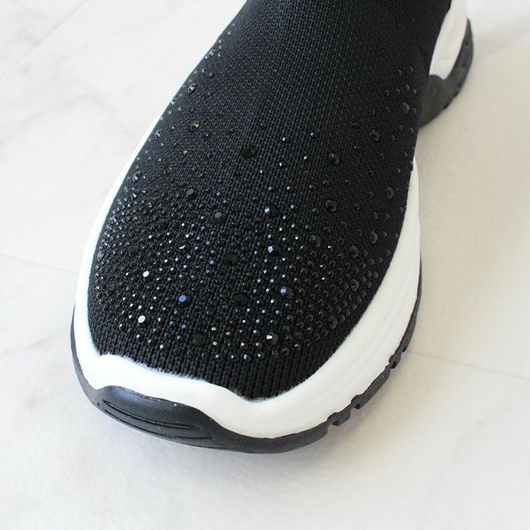 つま先に大小ビジューがあしらわれた華やかなニットブーツ。 柔らかく伸縮性があり足首をきれいに見せてくれるデザインと、ブーツながらも約340g程度と軽量な作りが特徴です。 カジュアルからきれいめなスタイル、スカートやパンツスタイルなど幅広い装いにマッチし、スニーカー感覚で快適に履いていただけます。