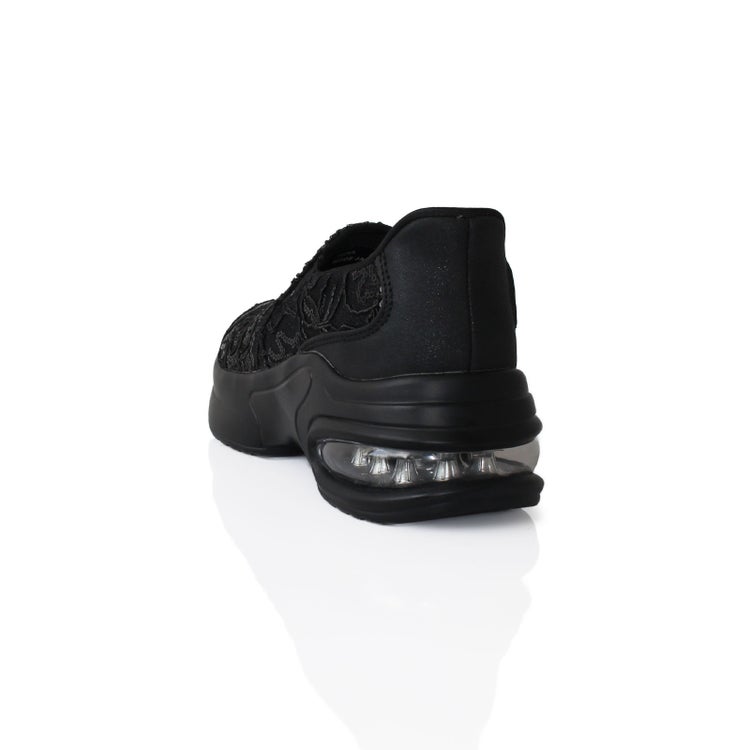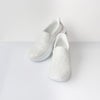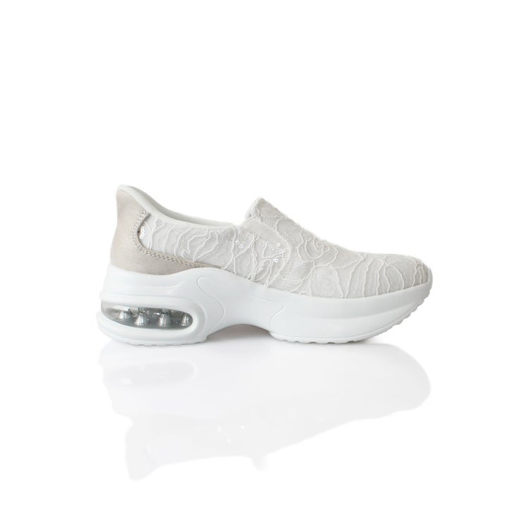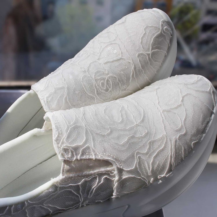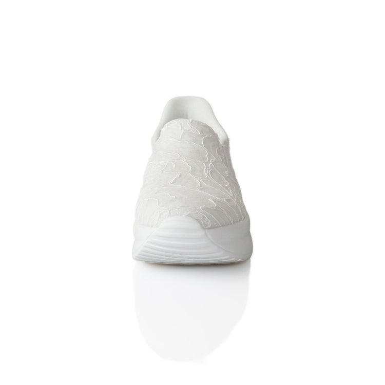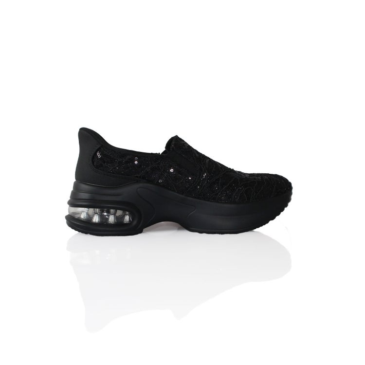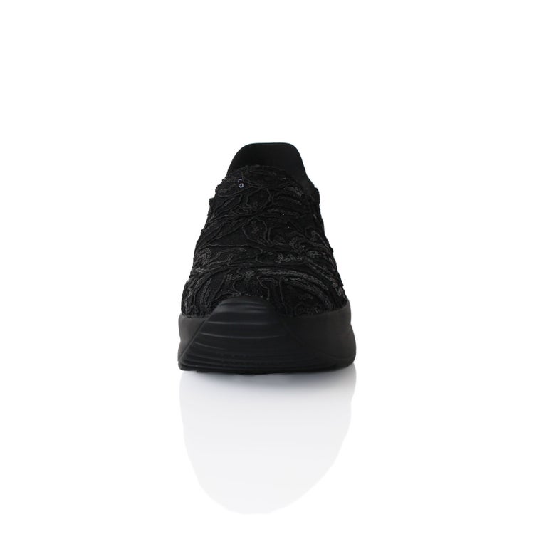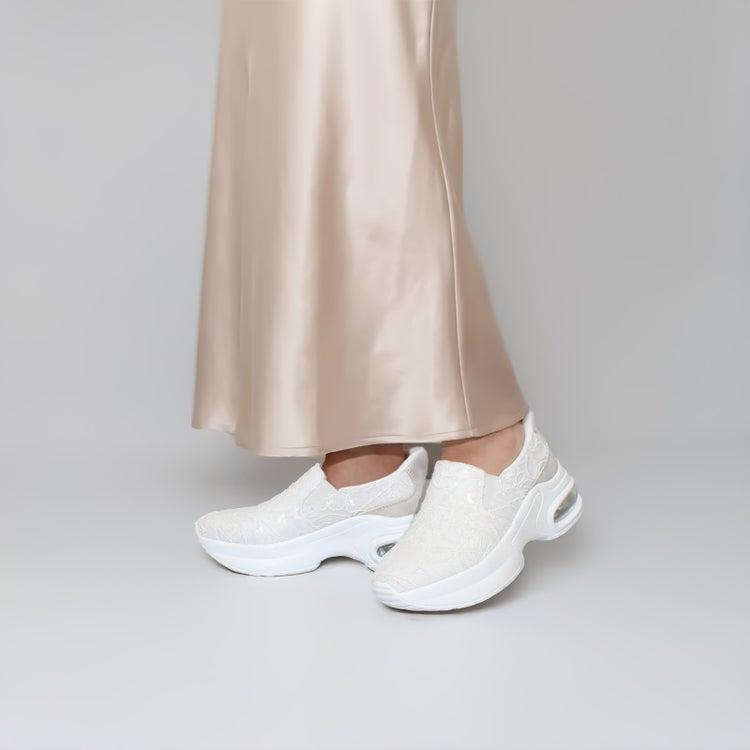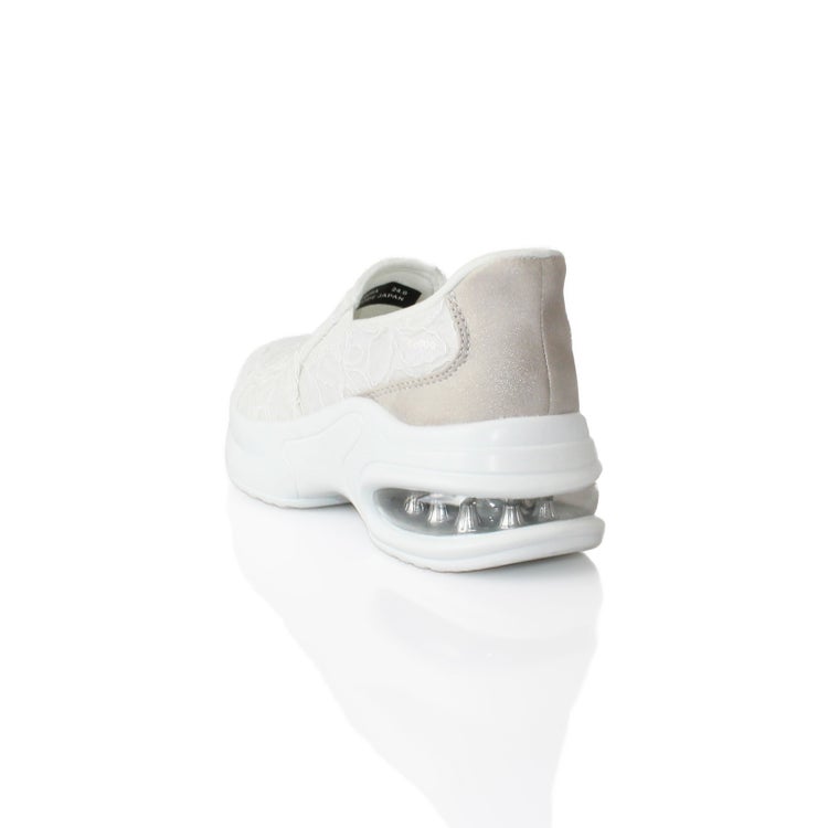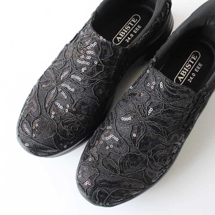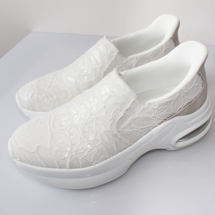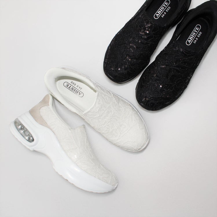 アッパーの全体をレースで覆ったレザー調スリッポン。靴べらなしで立ったまま履け、クッション製のある靴底で疲れを軽減。かかとの高さが5cmほどあるのでスタイルアップ見えも叶います。
