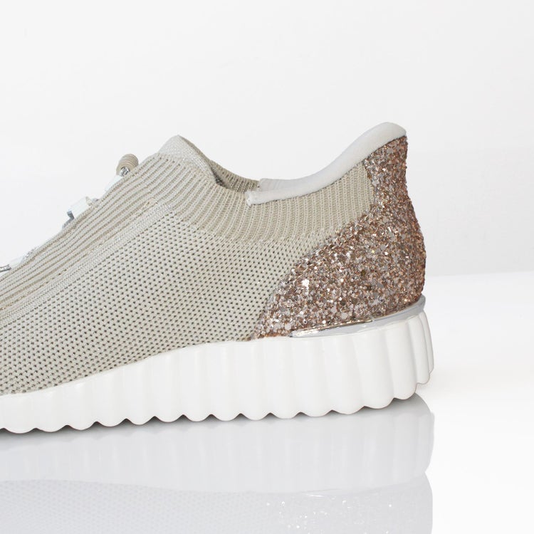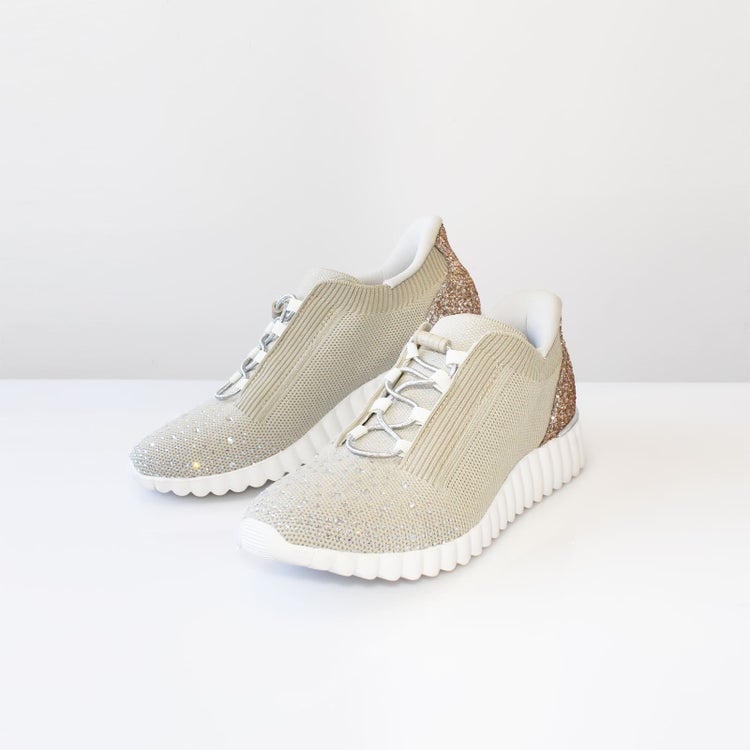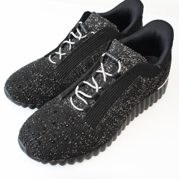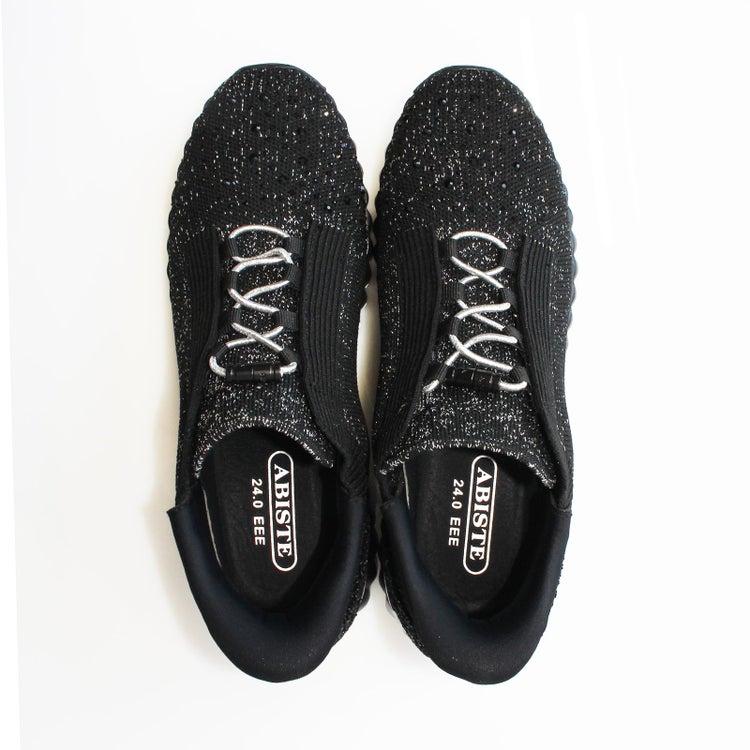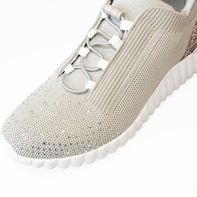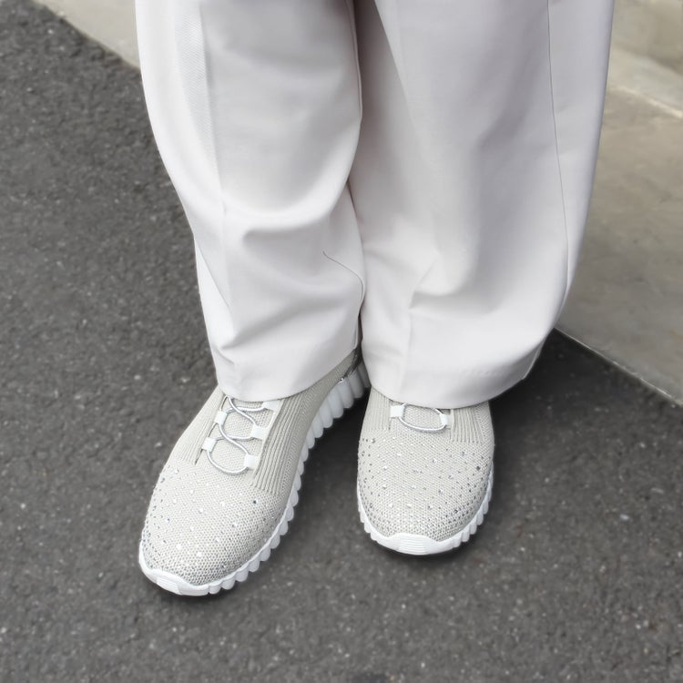 アッパーにガラスストーン、カウンター(後ろ部分)にグリッターをあしらったキラキラのニットスニーカー。靴紐を結ばないタイプで、靴べらなしでスルッと履けるストレスフリーな仕様です。