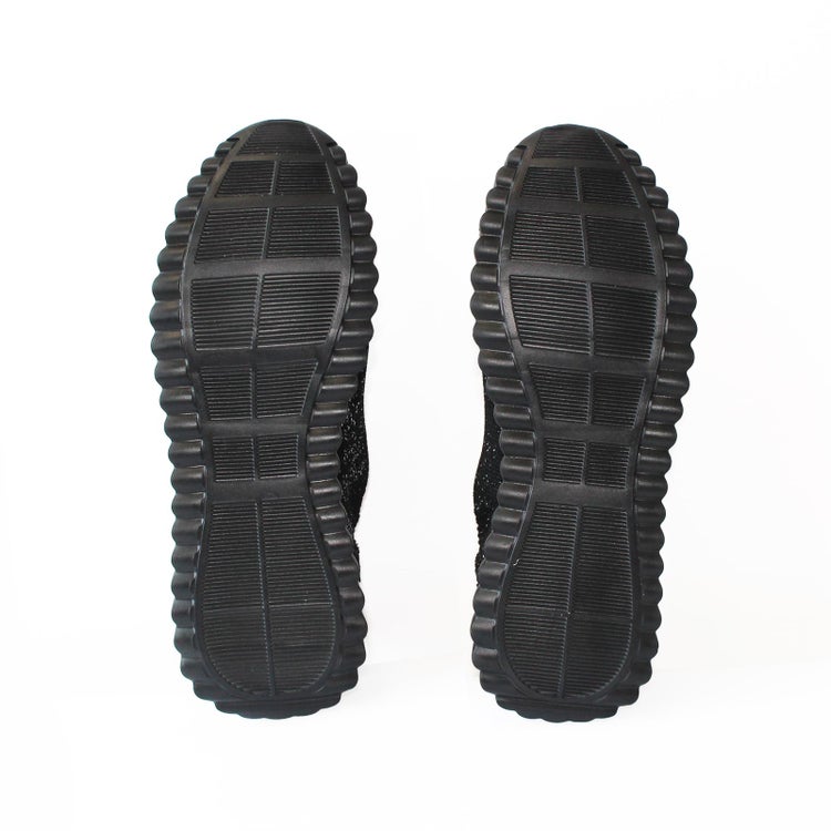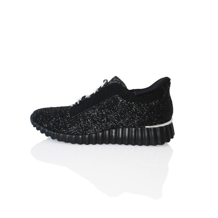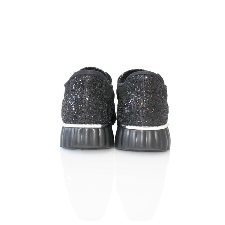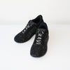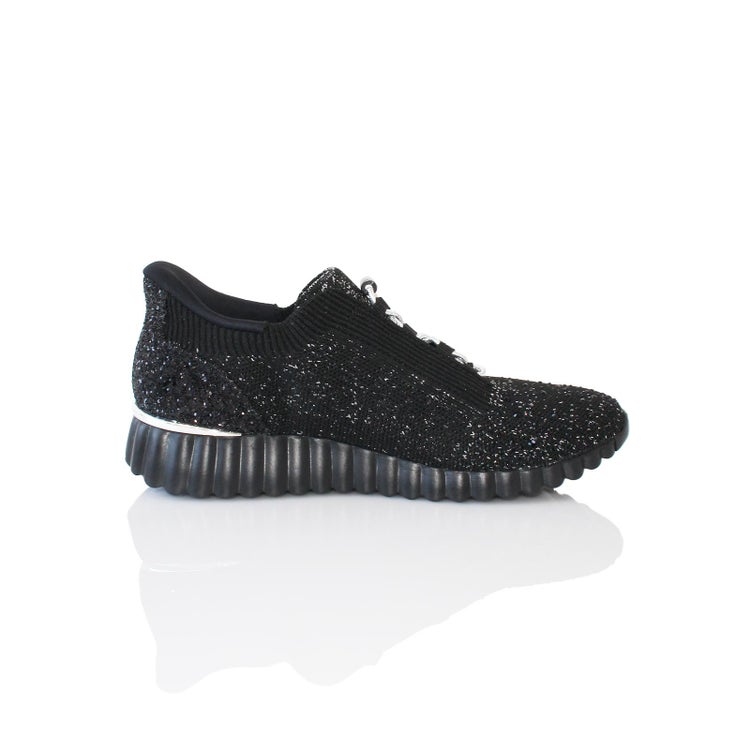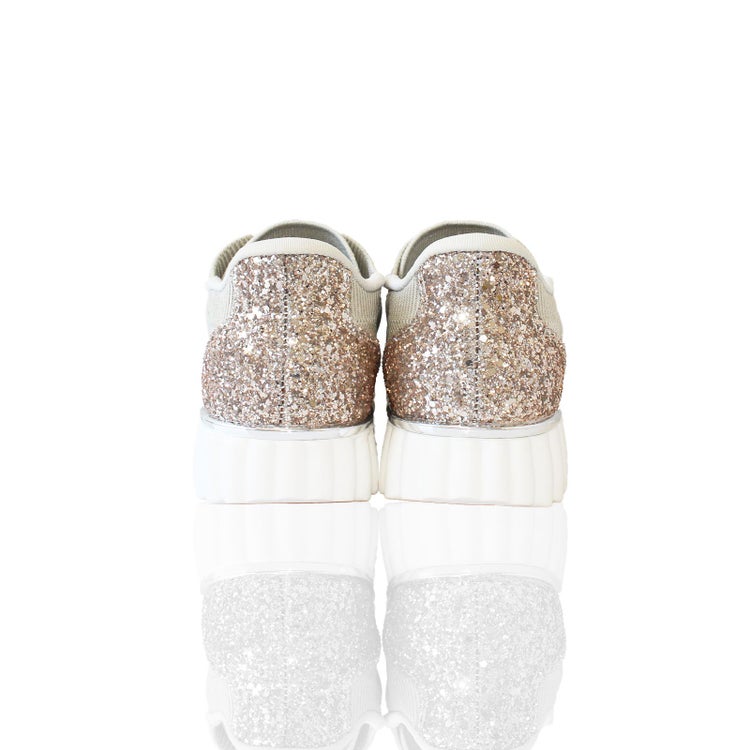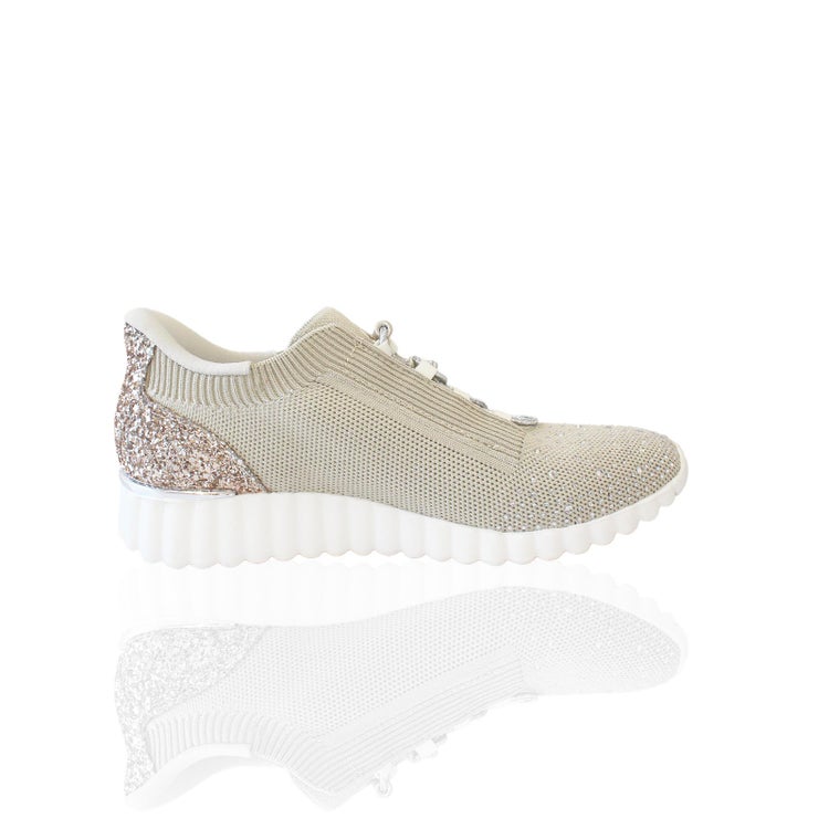 アッパーにガラスストーン、カウンター(後ろ部分)にグリッターをあしらったキラキラのニットスニーカー。靴紐を結ばないタイプで、靴べらなしでスルッと履けるストレスフリーな仕様です。