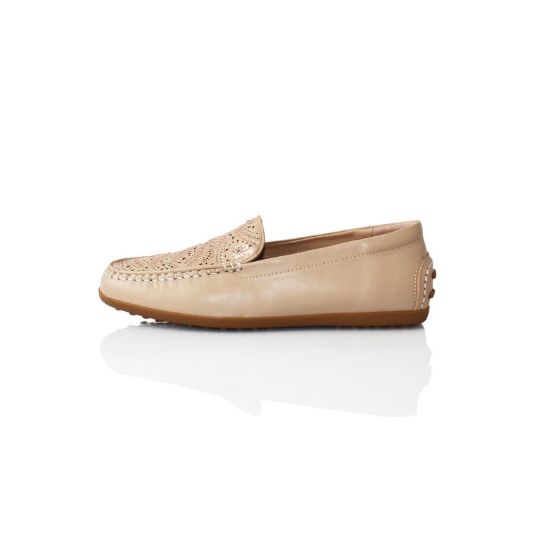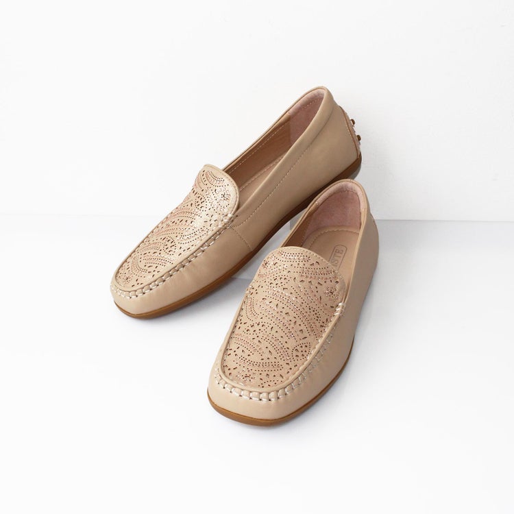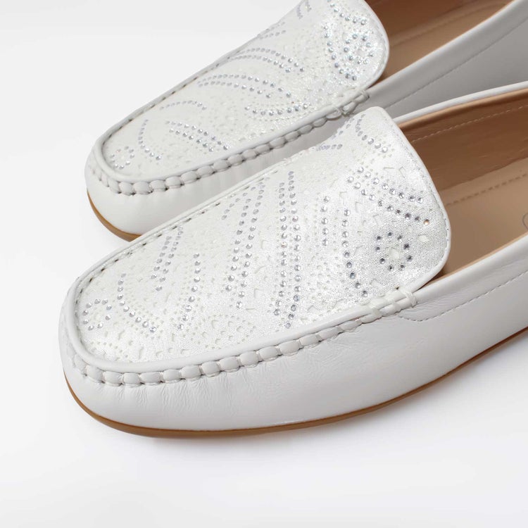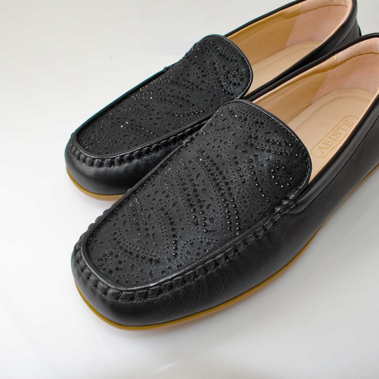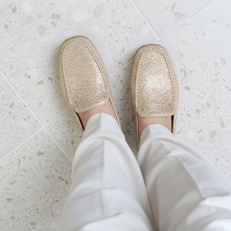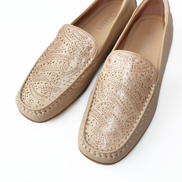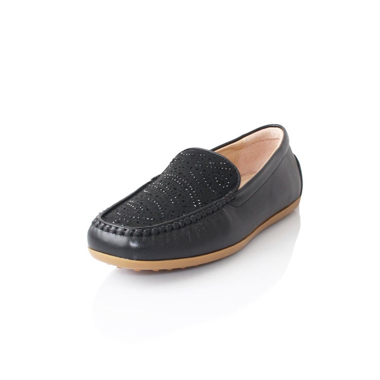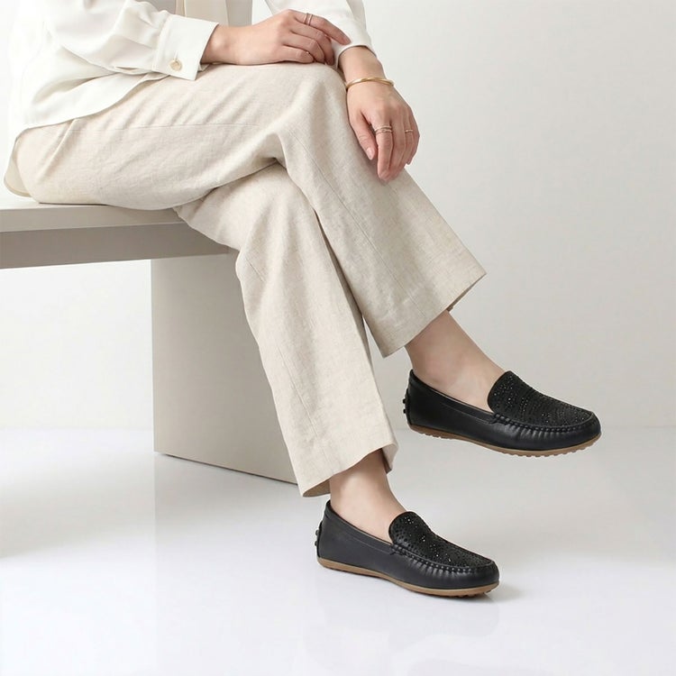 シャイニーなアッパーにガラスストーンをあしらったモカシンスリッポン。アッパーには牛革、インソールには羊革を使用し、天然素材ならではの通気性で快適。柔らかく足を包み込むような履き心地です。