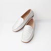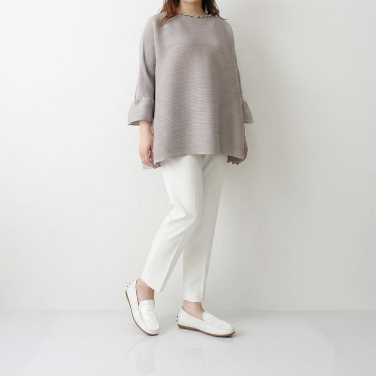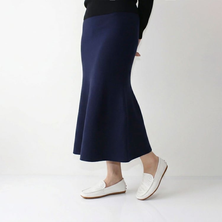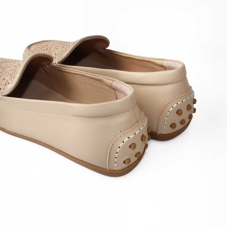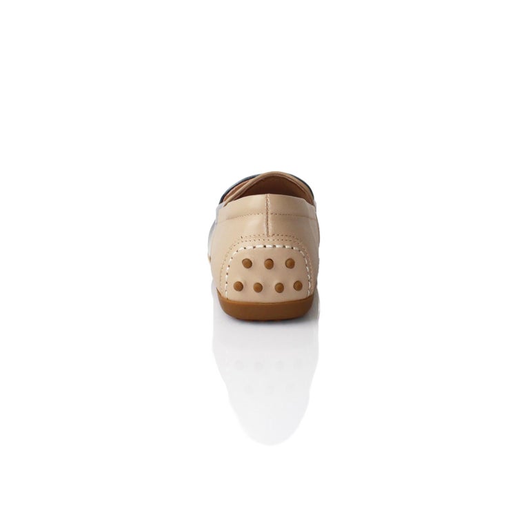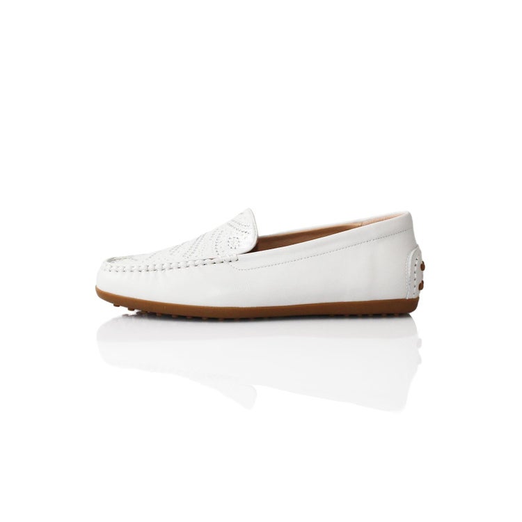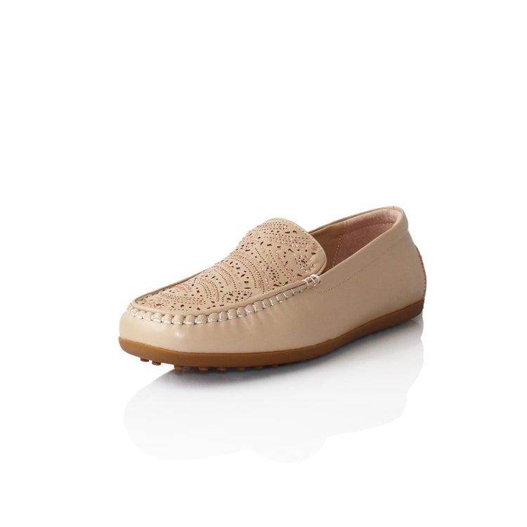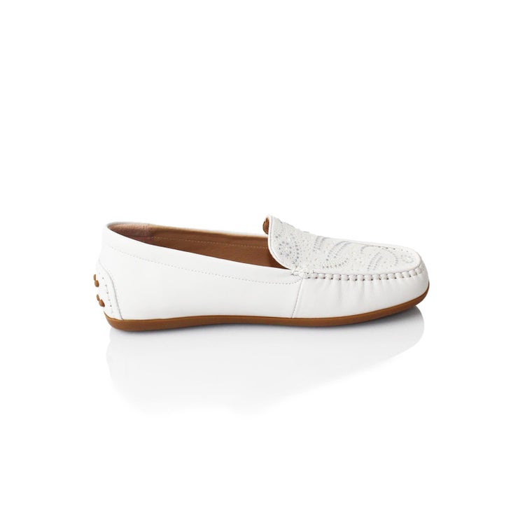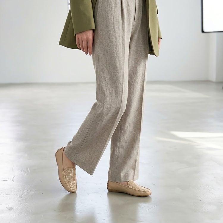 シャイニーなアッパーにガラスストーンをあしらったモカシンスリッポン。アッパーには牛革、インソールには羊革を使用し、天然素材ならではの通気性で快適。柔らかく足を包み込むような履き心地です。