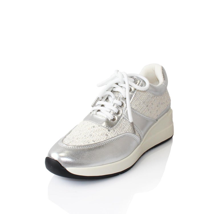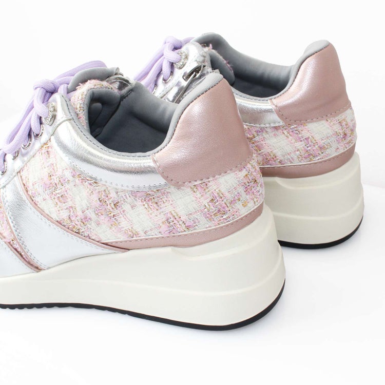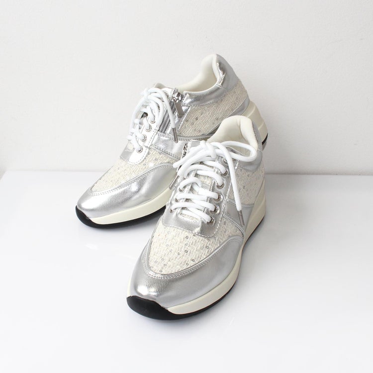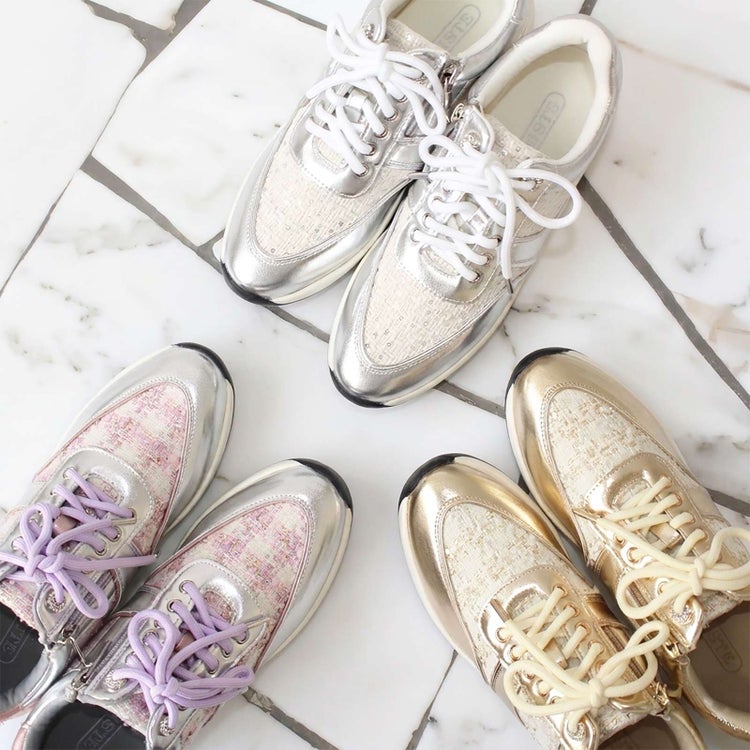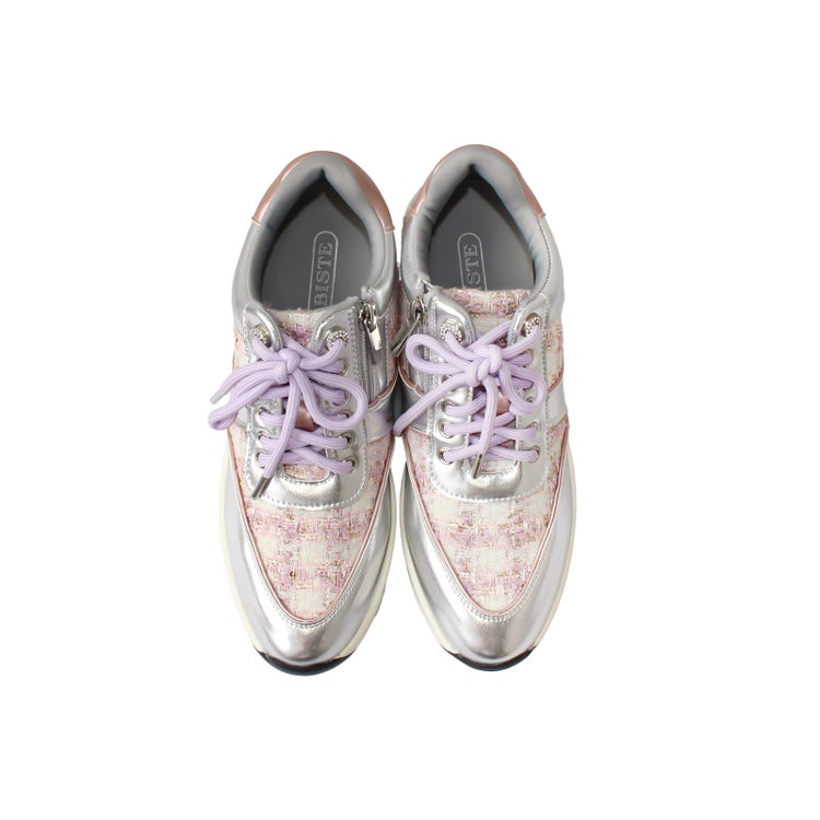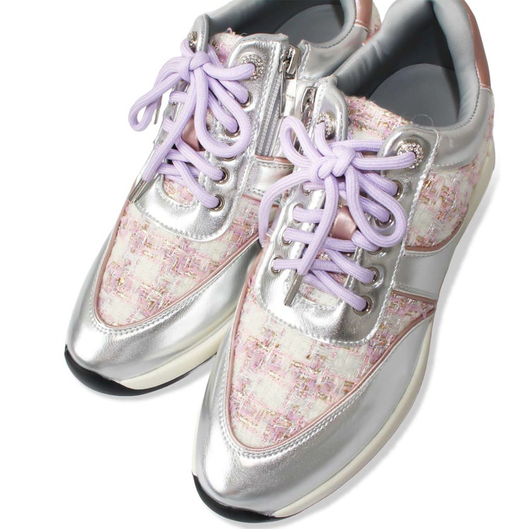 シャイニーなエコレザーに柔らかいカラーのツイードをドッキングしたスニーカー。