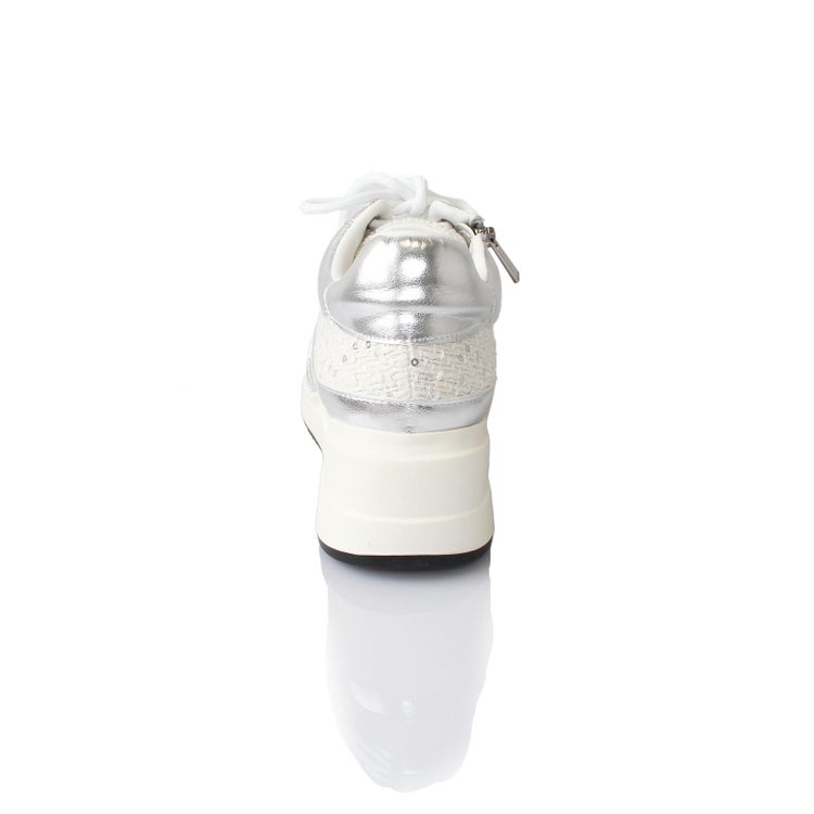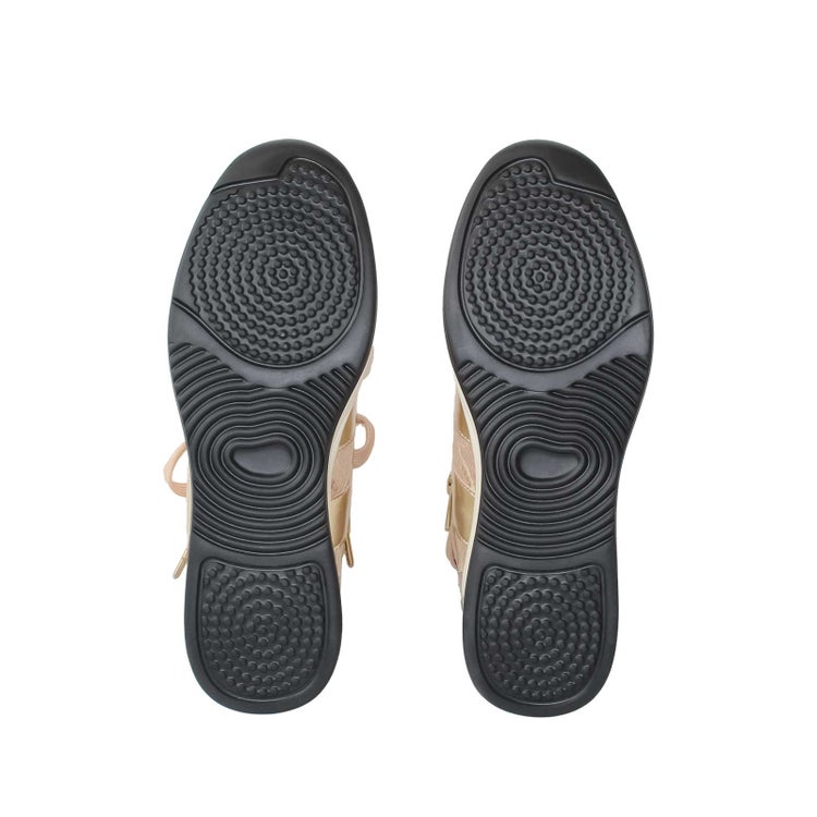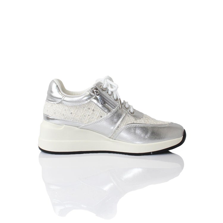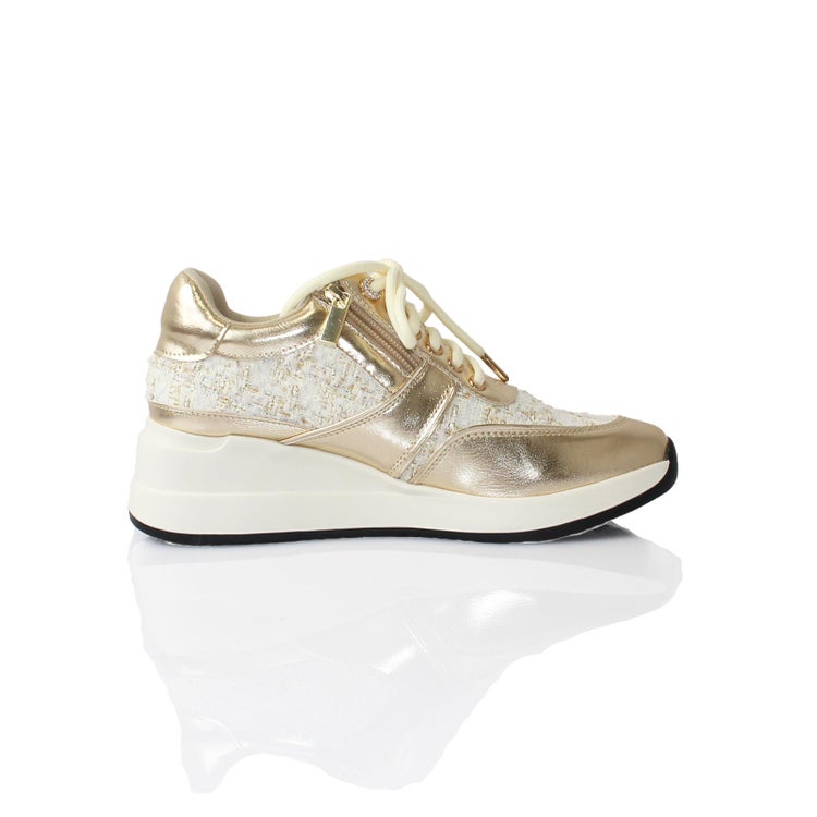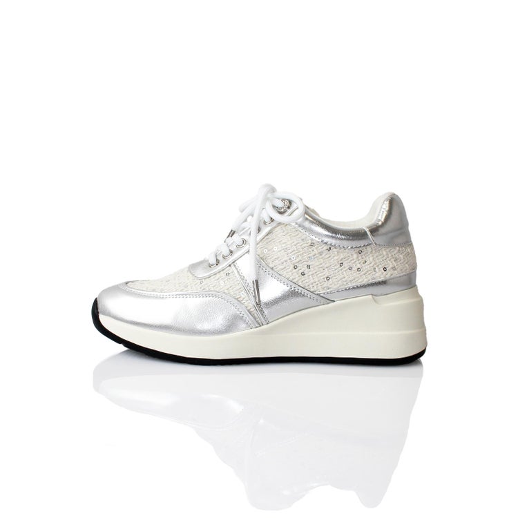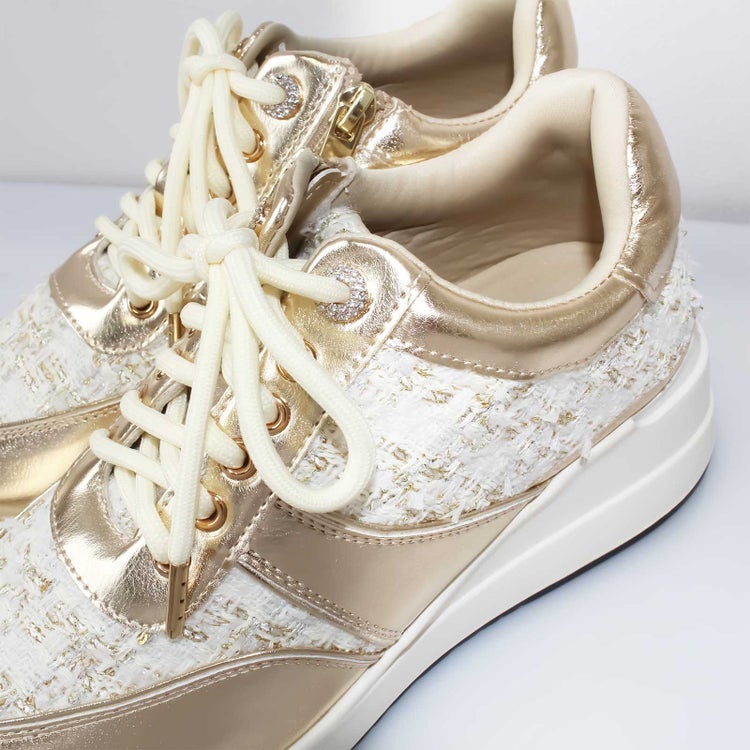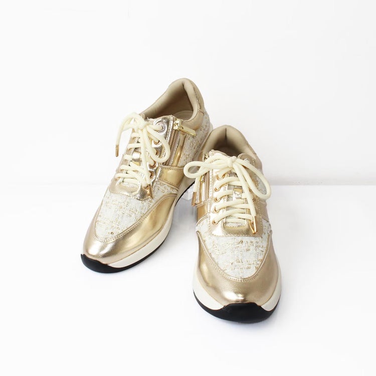 シャイニーなエコレザーに柔らかいカラーのツイードをドッキングしたスニーカー。
