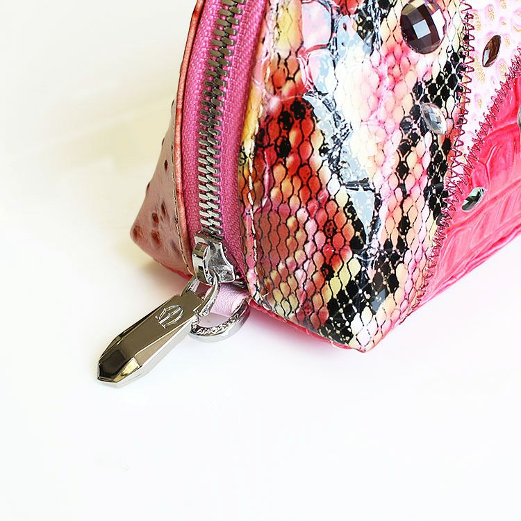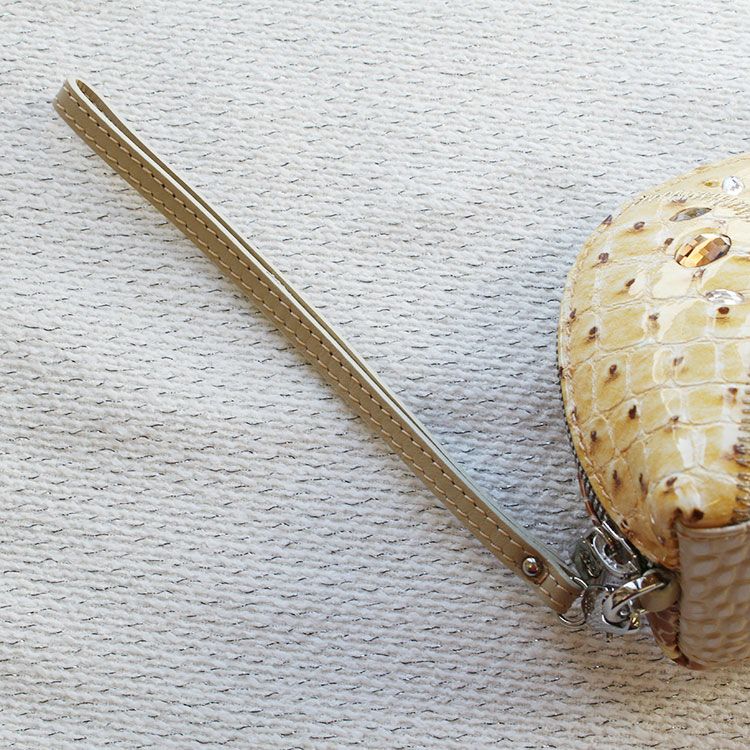 表面にあしらわれたガラスは、単に革の上に接着しているのではなく、革をカットして埋め込んでいるので、引っ掛かりが少ないのもポイント。