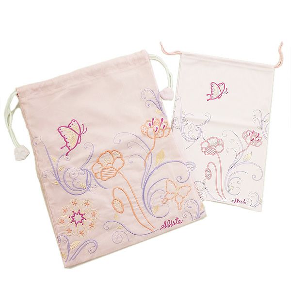 綿生地に光沢のあるオーガンジーで二重にした上から、お花や蝶々などのエレガンスな刺繍をほどこしたのが、シリカゲル入りのシューキーパーとスリッパ、マルチポーチと衣類用巾着袋。