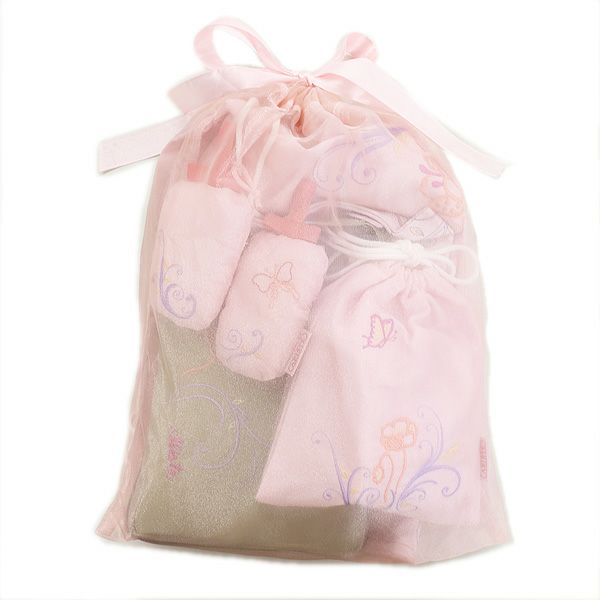 綿生地に光沢のあるオーガンジーで二重にした上から、お花や蝶々などのエレガンスな刺繍をほどこしたのが、シリカゲル入りのシューキーパーとスリッパ、マルチポーチと衣類用巾着袋。