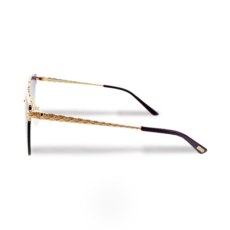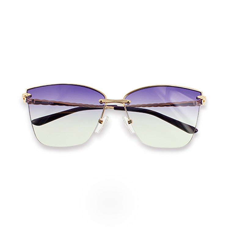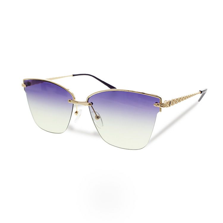 メタルのスクエアフレームにカラーレンズを合わせたサングラス。ゴールドトーンの細かい模様が輝くテンプルがポイントです♪