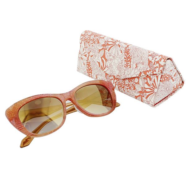 ケースはリバティジャパン社とのオフィシャルコラボにより実現した、リバティアートファブリックを使用した折り畳みケース。しっかりとサングラスを保護しつつ、サングラス着用時にはコンパクトにしまえて便利です。