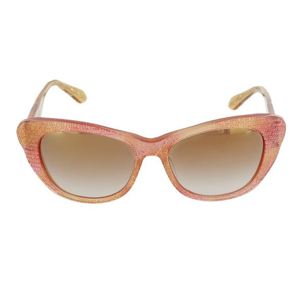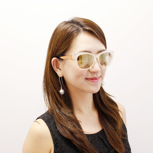 めがねの街、福井県鯖江でデザイン・制作したサングラス。女性らしいフォルムのフレームには微細なラメ感があり、さりげなくも華やか。注目すべきはテンプルの芯の形。透けて見える特徴的なデザインは横顔のアクセントになり、細部までこだわる大人のおしゃれを感じさせます。