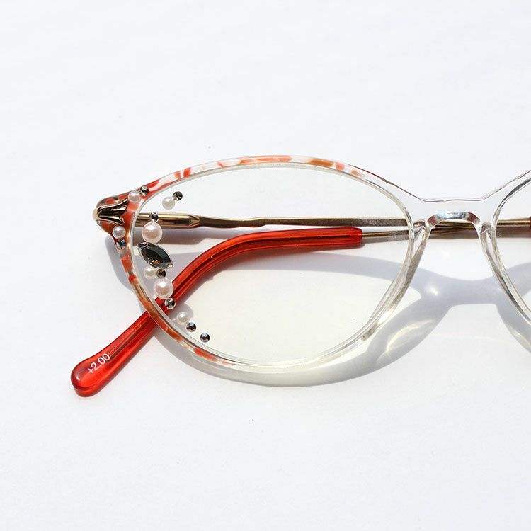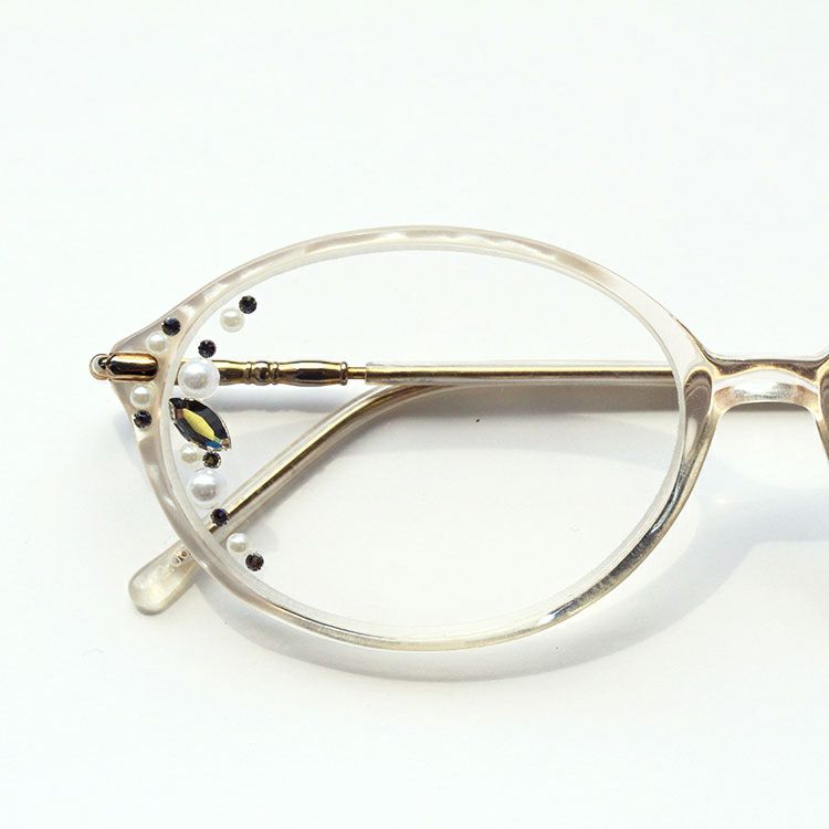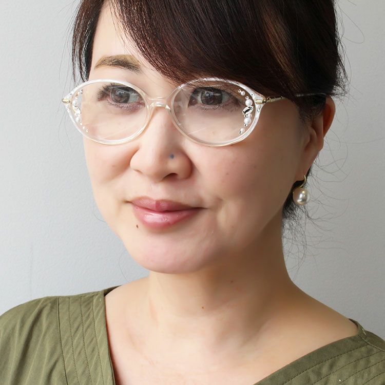 レンズフェイスサイドに散りばめられたクリスタルガラスがお顔まわりを華やかにしてくれます。ところどころにあしらわれたプラスチックパールがより一層フェミニンな印象に。