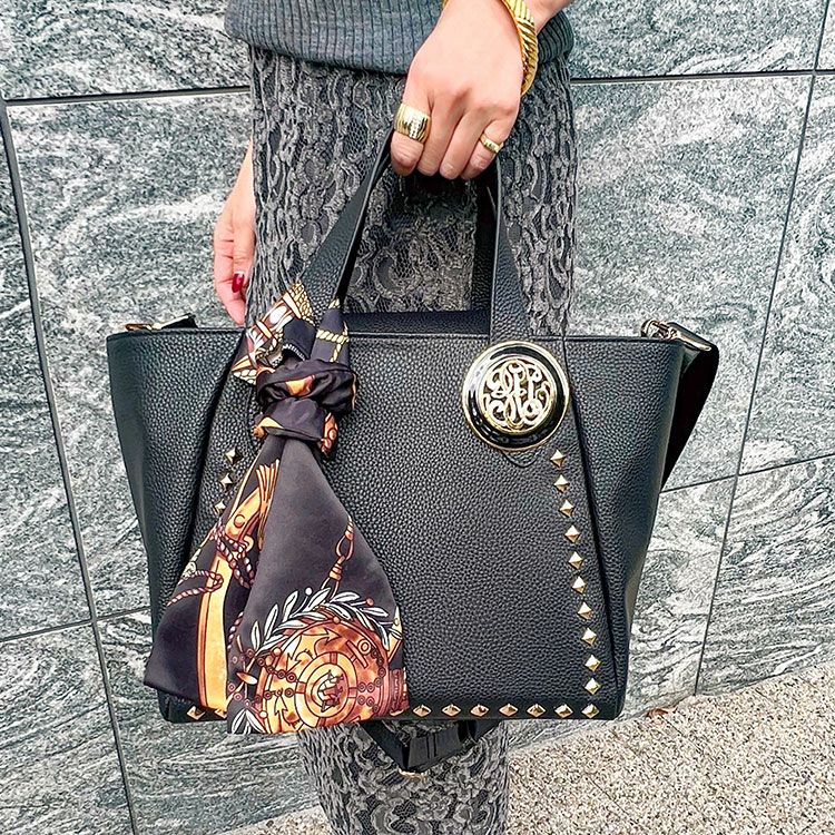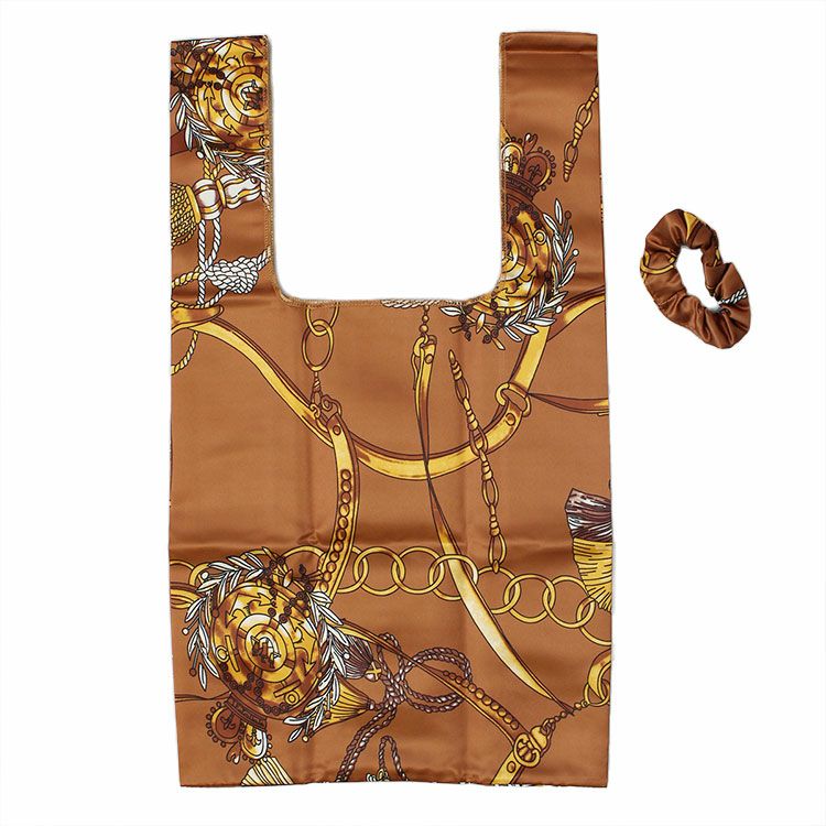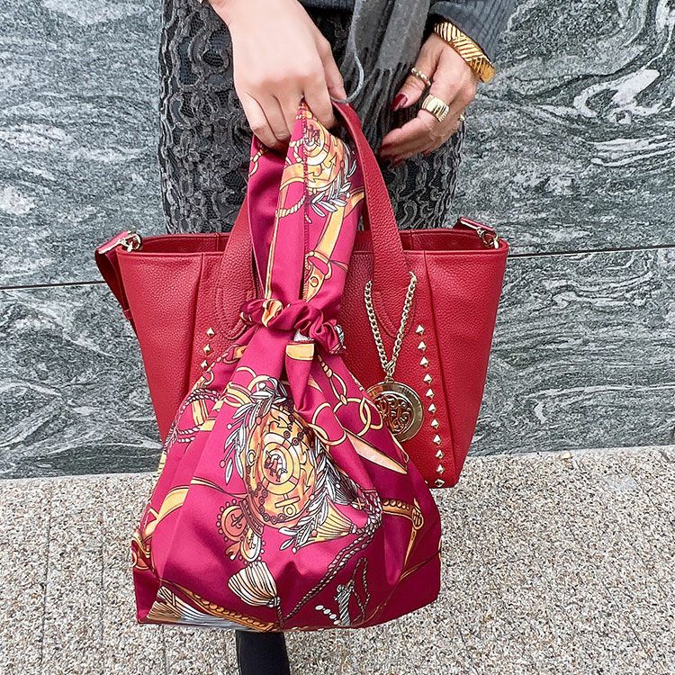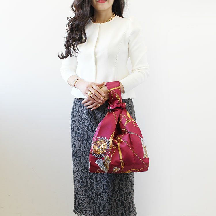 スカーフ柄のプリントだけでなく、生地そのものが持つ程よい張りや光沢感がクラス感を演出。ファッションアイテムのスカーフと遜色ない質感なので、サブバッグやエコバッグとしてご使用になる日にはメインバッグのハンドルに掛けて付属のシュシュで留め、バッグアクセサリーとしてお使いいただくのもオススメです。